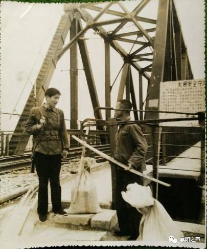 襄樊汉江一桥刚开通时兵民在桥上值勤,当时大桥刚开通火车铁路线,汽车,人行,都还没有修通,这位农民想从铁路线通过被民兵拦着了……
