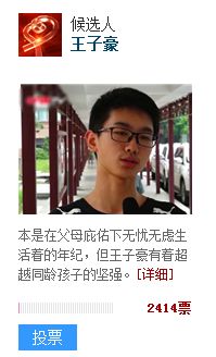 目前,网络投票已全面启动,登录“感动中国2017年度人物评选”官方网站为王子豪投上一票!(根据投票规则,每天同一IP地址最多可投10票。可每日重复投票。)