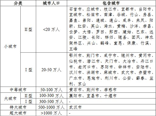 截至2015年底,湖北有特大城市(500-1000万人)1个,大城市(100-500万人)3个,中等城市(50-100万人)3个,I型小城市(20-50万人)26个,II型小城市(<20万人)43个。