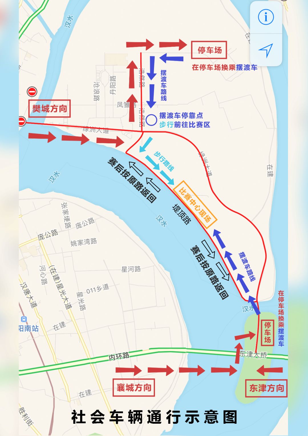 从樊城前来观赛的市民,驾车前往鱼梁洲绿洲大道尽头,左转前往浩然路,到达指定停车场(可容纳500台车)。可乘坐摆渡车到达绿洲大道和浩然路交叉路口附近,根据指示牌步行前往赛场。