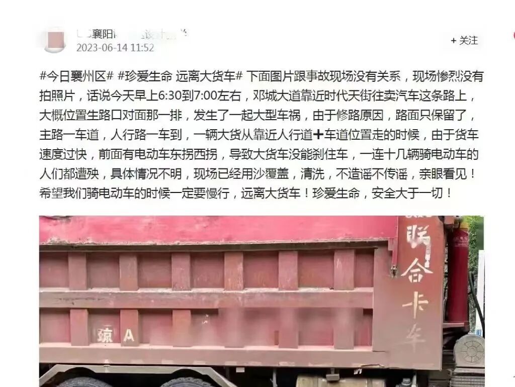 信息称在襄州区某路段发生大货车失控碾压多辆电动车造成多人伤亡,还配发现场血腥事故照片。网安大队民警迅速向上级部门汇报,同步核实信息内容。
