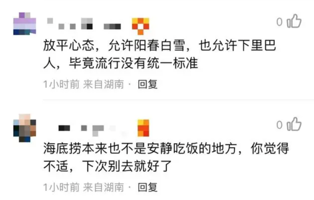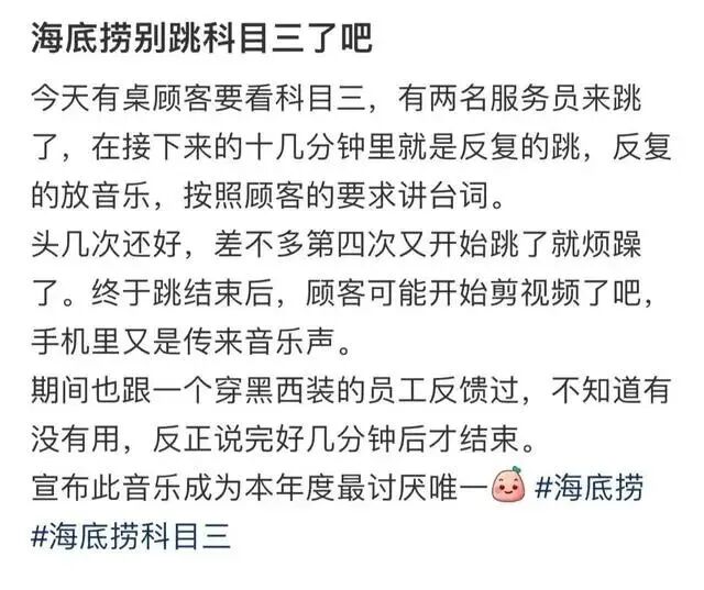 但对于海底捞这一服务,众人看法不一。近日,杭州一女子发帖,吐槽自己和家人去海底捞吃饭时的经历,表示让自己很不适。她表示“昨天一家人给妈妈过生日,去了海底捞吃饭,整个过程中,此起彼伏地响起了一个很吵的音乐,随后,有男服务员和女服务员出来跳舞(那种扭来扭去的土味舞蹈……)真的让人很不适啊。一问是顾客点的,叫‘科目三’舞蹈,网上很火。评论区简直辣眼睛,真的想不通,这种事情为什么会忽然火啊……我带着孩子看服务员扭来扭去,觉得很恶心……”还有顾客表示“真的炸裂,海底服务员工作站了一天还要去跳舞,而且我感觉绝对不止跳一遍,有些客人就是为了拍视频上网络赚取流量叫人跳的……”