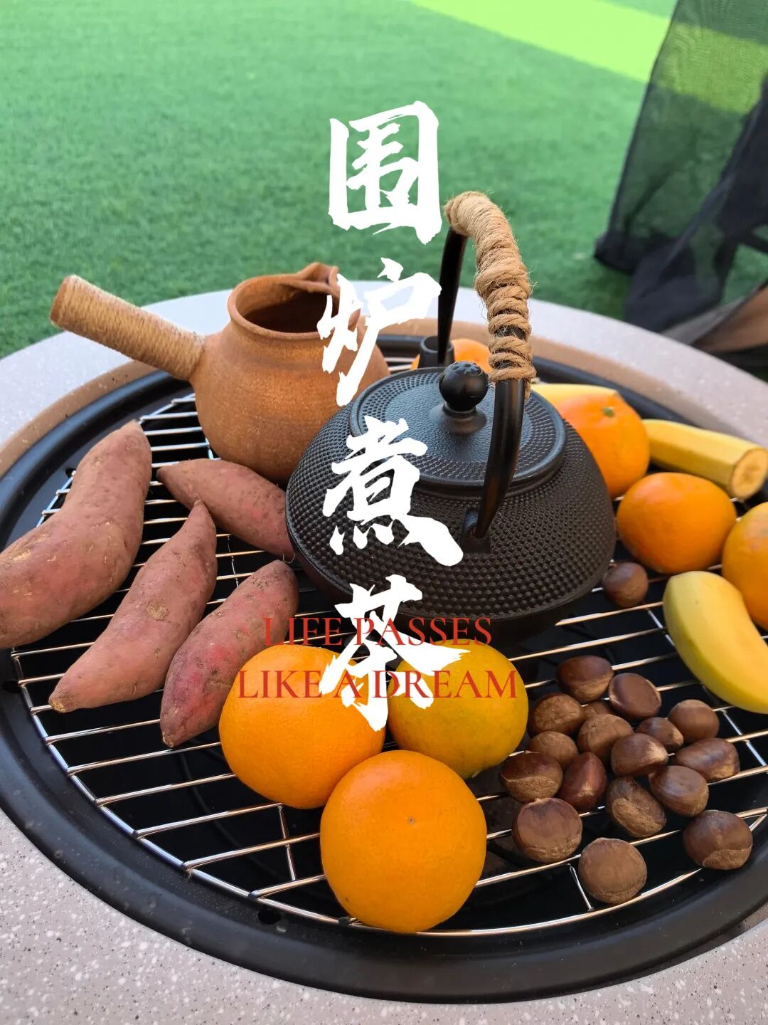12月1日,在鱼梁洲露营基地,不少市民朋友在帐篷里“围炉煮茶”,炉子上摆着一壶热茶、一壶罐罐烤奶,还有红薯、花生、板栗、橘子、香蕉等,看起来十分惬意。