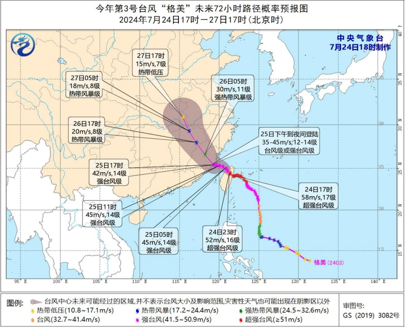 台风“格美”7月24日上午已经加强为超强台风级别,于7月24日夜间在台湾登陆,之后穿过台湾岛,于今天(7月25日)下午至夜间在福建沿海登陆,然后向西北方向继续移动,移动路径最大可能是福建——江西——湖北——河南,强度逐渐减弱。