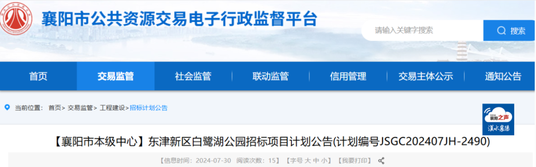 襄阳市公共资源交易网日前发布东津新区白鹭湖公园招标项目计划公告。