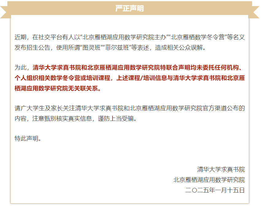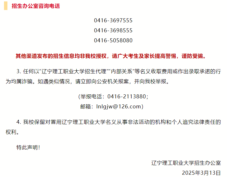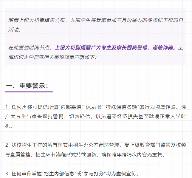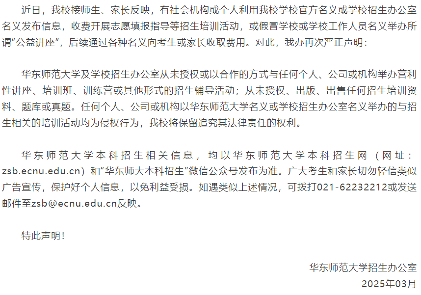 清华大学、中国科学技术大学、华东师范大学、兰州大学、上海纽约大学、辽宁理工职业大学、宁波诺丁汉大学、重庆工业职业技术学院等院校,通过官方渠道发表声明,郑重提醒广大考生及家长务必保持高度警惕,增强防范意识,切勿轻信这些虚假宣传,谨防陷入诈骗陷阱,切实维护自身的合法权益。