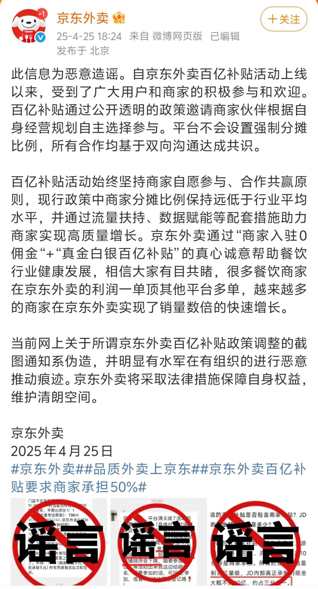 4月25日,针对京东外卖百亿补贴要求商家承担50%补贴,京东回应表示此为恶意造谣,平台不会设置强制分摊比例,所有合作均基于双向沟通达成共识。