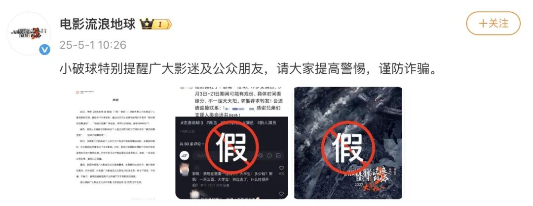 近期,社交平台上出现电影《流浪地球3》招募临时演员的消息。5月1日,@电影流浪地球 对此发布声明,称从未授权任何机构或个人通过自媒体招募演员、投资方,请大家提高警惕,谨防诈骗。 来源:南方都市报 编辑:李春辉