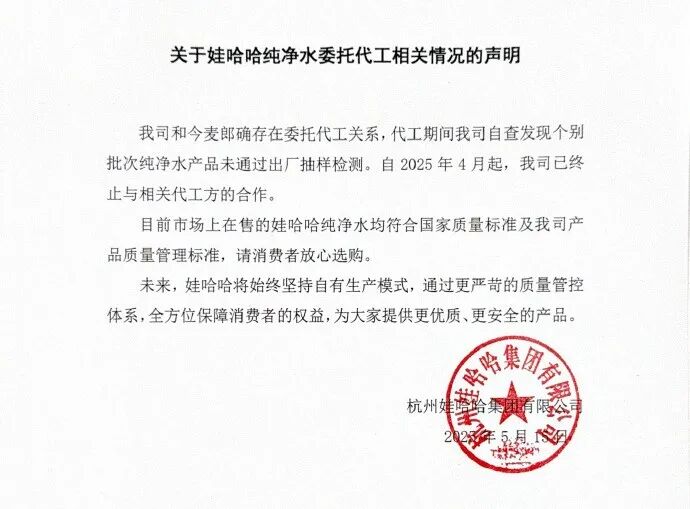 我司和今麦郎确存在委托代工关系,代工期间我司自查发现个别批次纯净水产品未通过出厂抽样检测。自2025年4月起,我司已终止与相关代工方的合作。