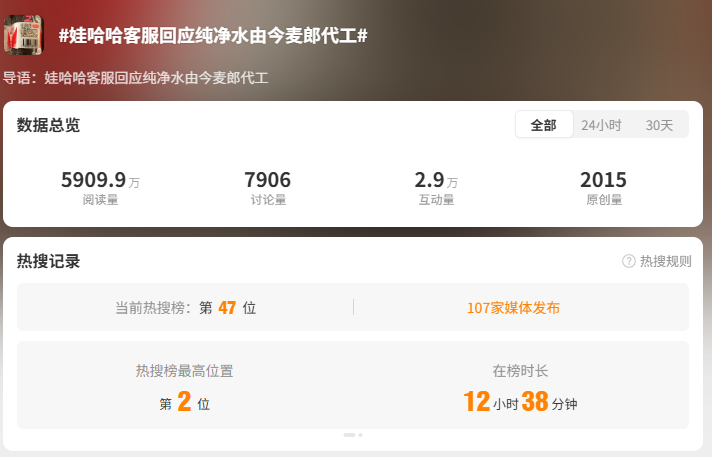 5月15日,#娃哈哈客服回应纯净水由今麦郎代工#登上微博热搜,引发热议。