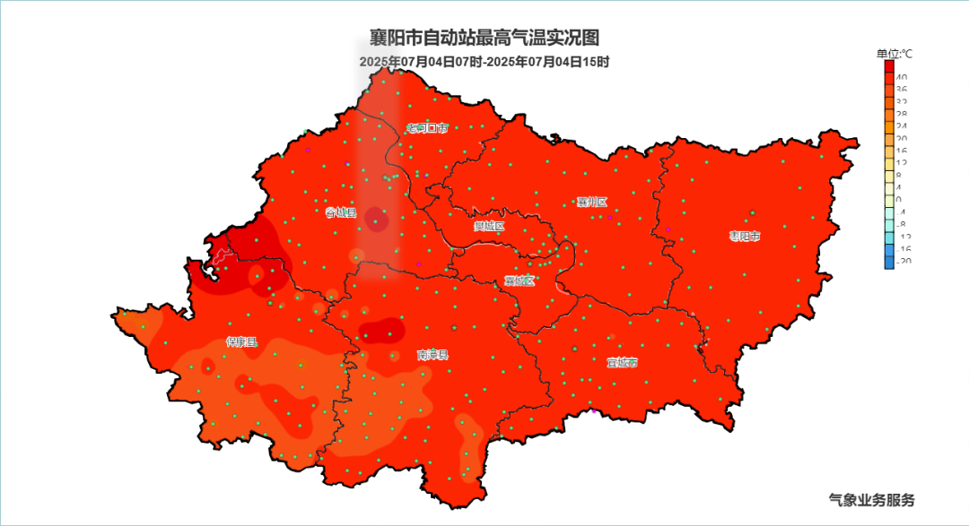据襄阳气象消息,昨天,襄阳大部地区日最高气温36~38℃,保康近40℃,拔得全省高温头筹,高温实况图“红彤彤”一片。