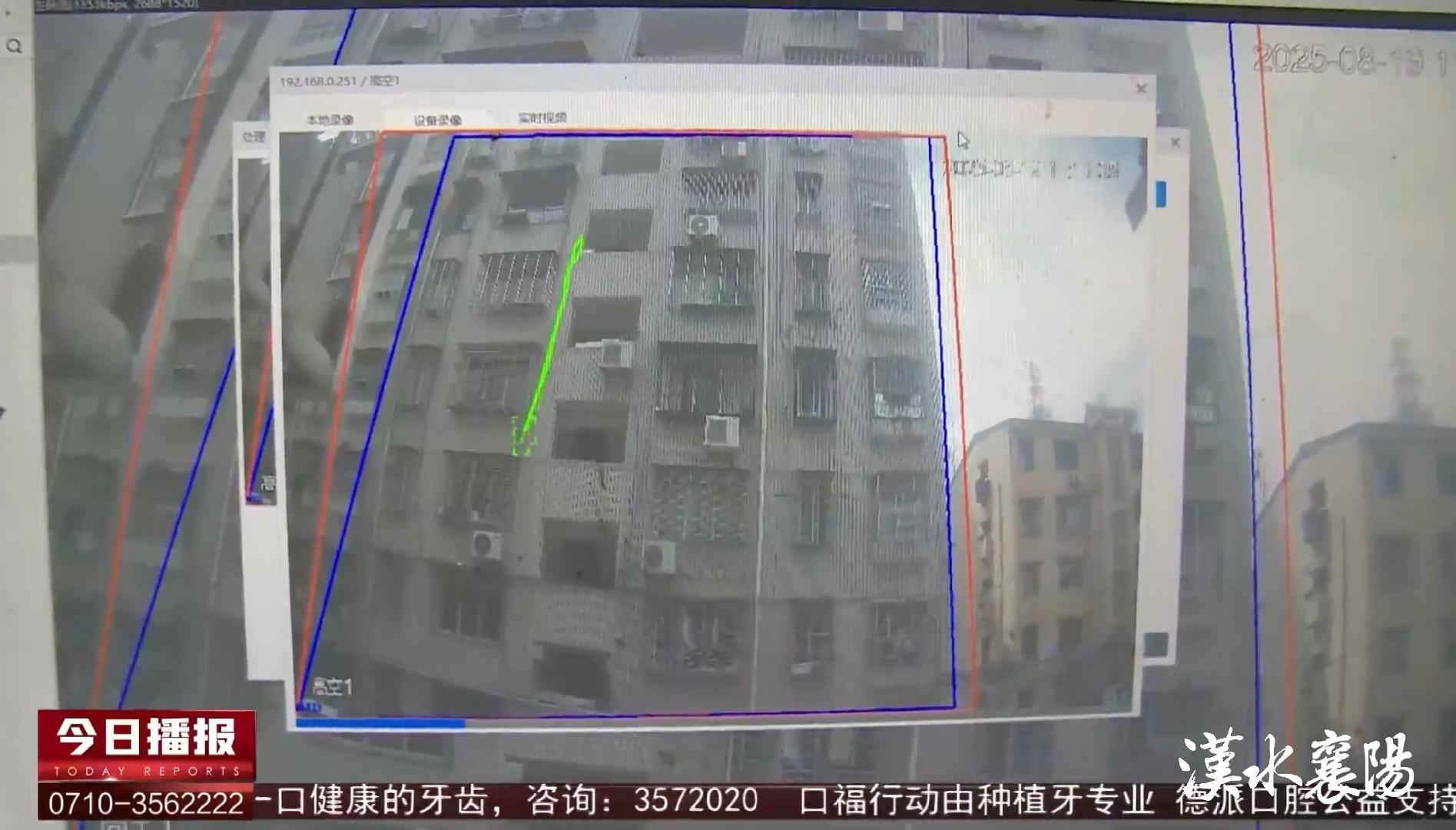 在襄州区张湾粮贸小区日前开展的一次实地演练中,技术人员从六楼抛下一个纸质手提袋,后台监控屏幕即刻清晰显示出一条绿色轨迹线,准确还原物品坠落路径。