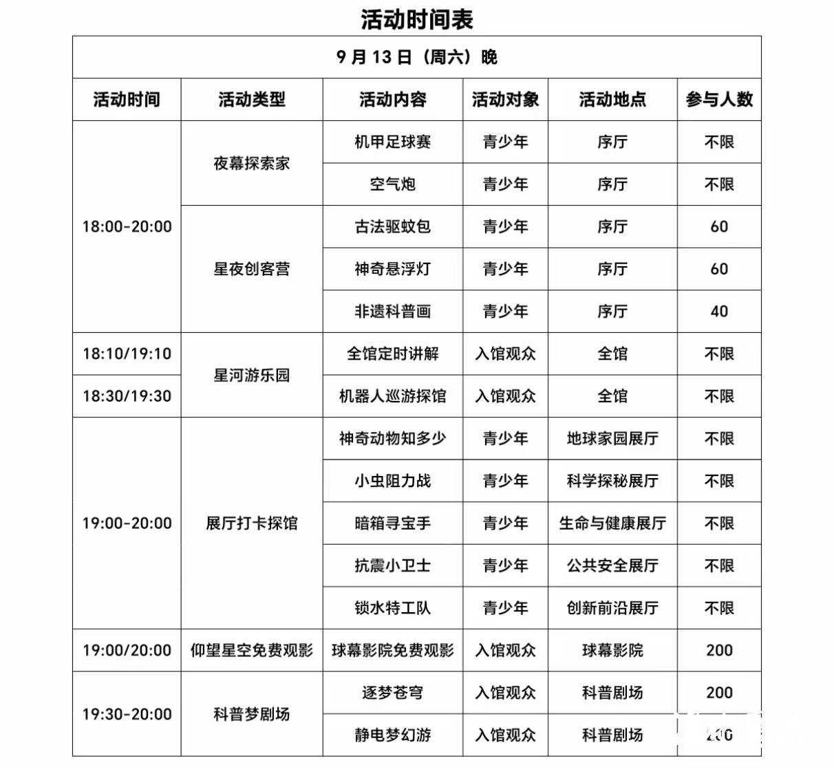 参与方式:序厅、展厅活动,当天至一楼服务中心报名。科普剧场活动无需报名,请提前15分钟前往科普剧场,座位有限,坐满为止,开场后十分钟停止入场。