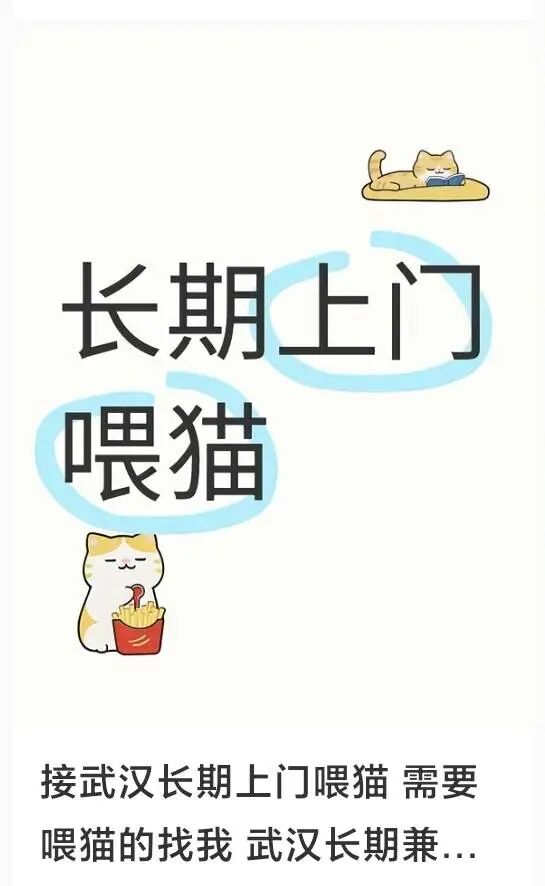近日,在相关网络平台可以看到,北京、上海、厦门、武汉等城市上门喂猫的服务报价很清晰,一般以自己居住地为准,距离3公里内30元/次,5公里内40元/次,每增加一只宠物加收5元。除春节外,节假日不涨价。