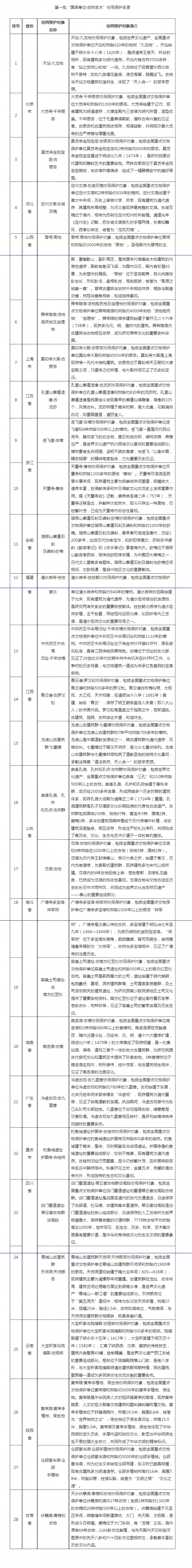 第一批“国保单位·古树名木”协同保护对象共28个,包括北京市的天坛·九龙柏,浙江省的岳飞墓·古樟,江西省的中共苏区中央局旧址·千年古樟,山东省的曲阜孔庙、孔林和孔府·古树群,陕西省的黄帝陵·黄帝手植柏、保生柏等。