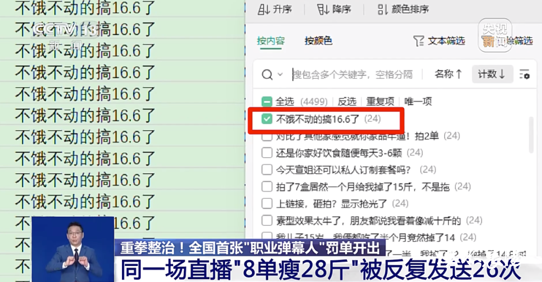通过市场监管人员导出的一场直播的所有虚假弹幕,有大量重复发送的虚假弹幕内容:在同一场直播中“8单瘦28斤”被反复发送了26次,“不饿不动瘦16.6”被发送24次。