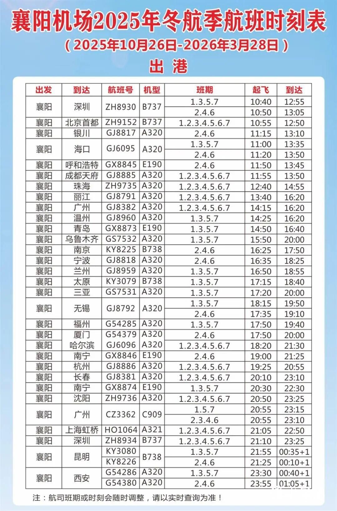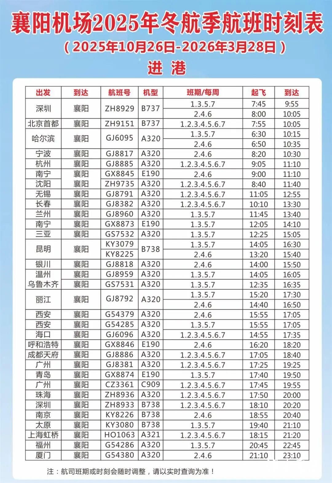 针对冬季运行特点,深圳、长春、广州等部分航线时刻有所调整。深圳航空执飞襄阳至深圳晚班进出港提前2个小时;长龙航空执飞的长春=襄阳=广州航线时刻也相应提前。部分航班号亦有变更,建议旅客购票时仔细核对。