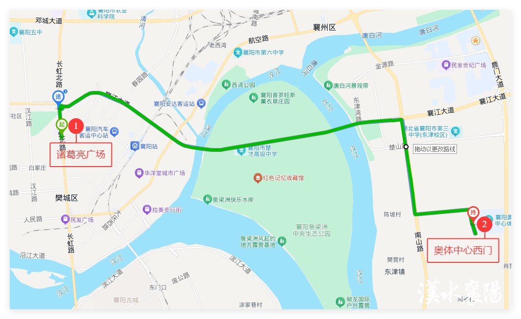 襄城定制专线由长虹桥南武商汇(原襄城客运站)发车,沿途停靠长虹南路武商汇、古城十字街、南湖广场、胜利街4个站点,全程35分钟;