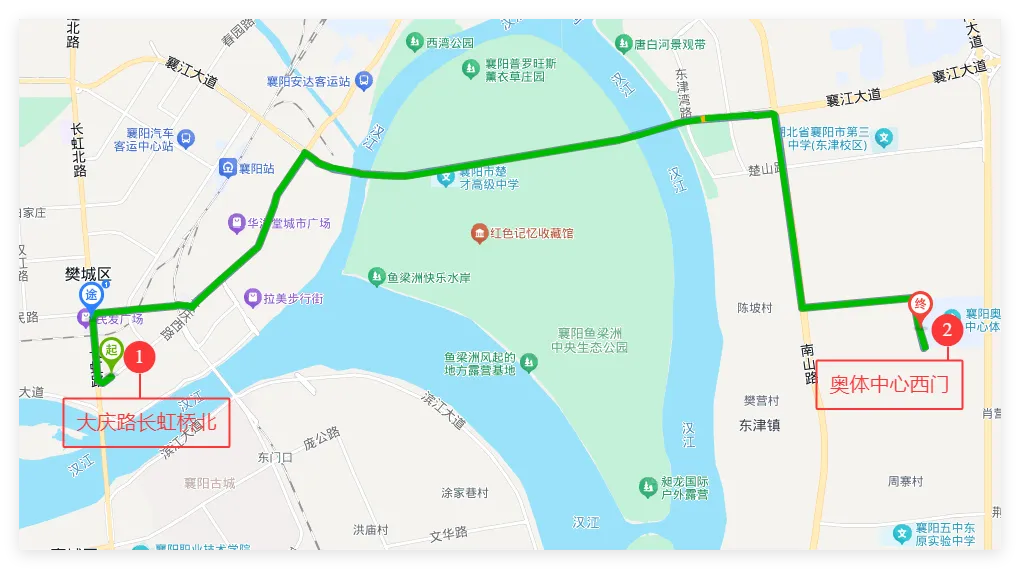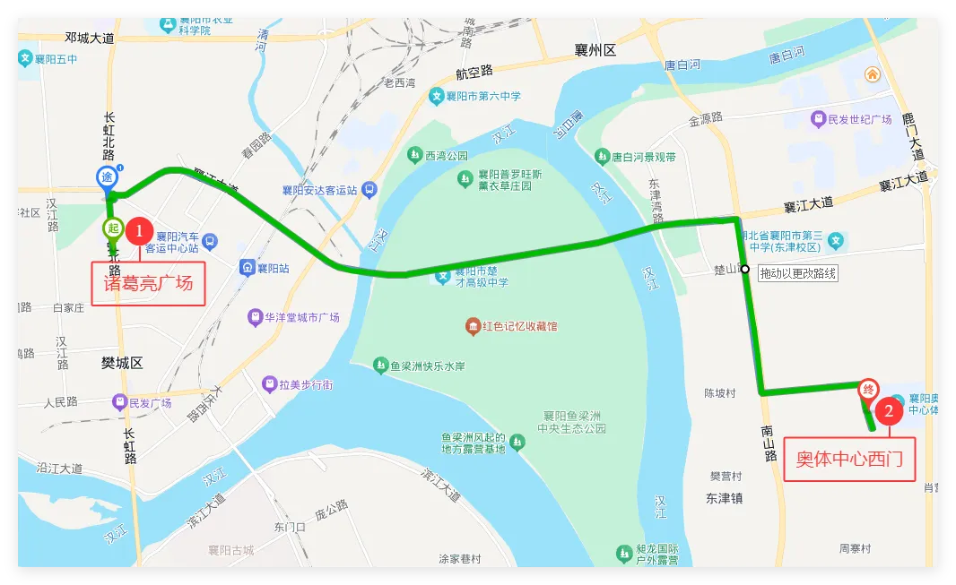 线路二:西停车场西门→浩然河东路→长山路→鹿门大道辅道→鹿门大道→东津大道→东津大桥→襄城