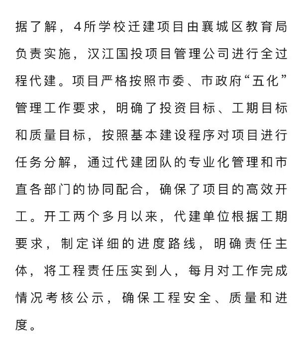 根据目前施工安排,4所学校迁建项目预计2025年12月主体结构完工,2026年6月完成装饰装修和室外景观,同步启动验收工作,2026年8月完成联合验收,2026年9月投入使用。
