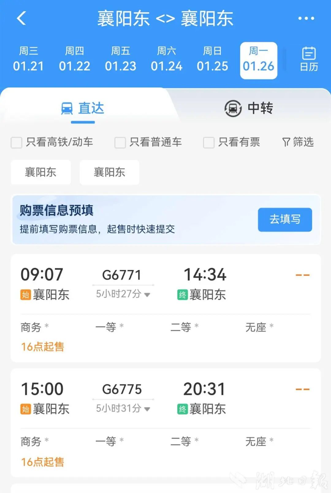 好消息传来!铁路12306 APP显示,1月26日起,铁路部门将开通“襄阳东至襄阳东”环线列车,车次每天2趟,分别为G6771、G6775。