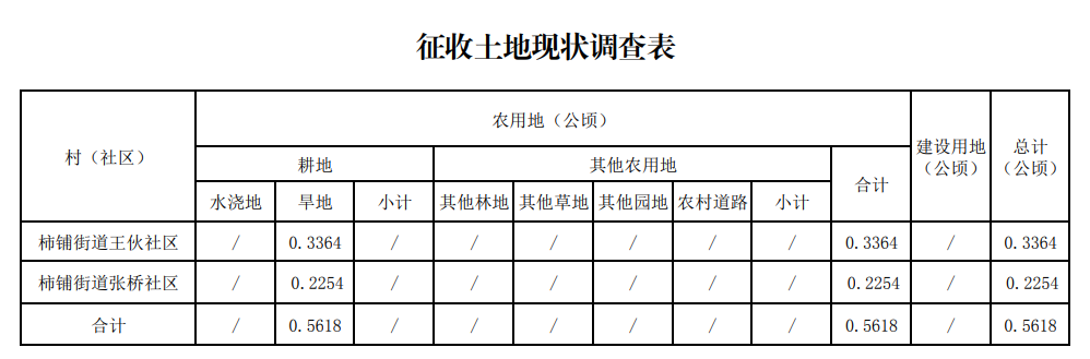 本次已对土地现状开展详尽调查,共涉及柿铺街道张桥社区、王伙社区农民集体土地总面积0.5618公顷,全部为耕地,地上附着物涉及苗木等。