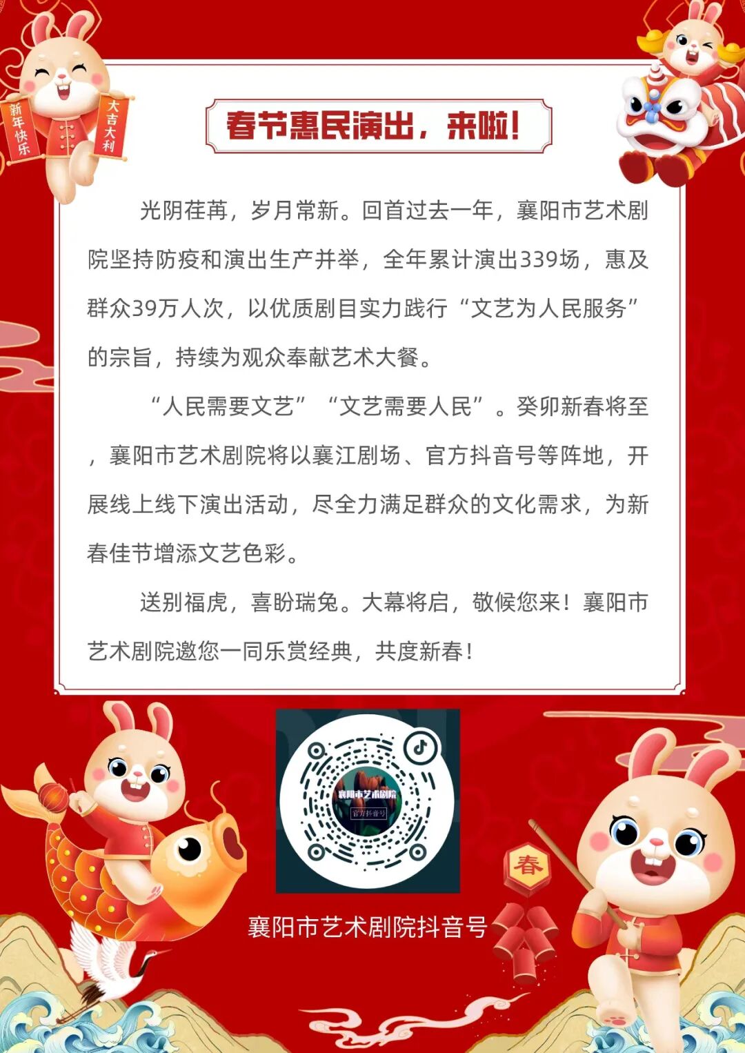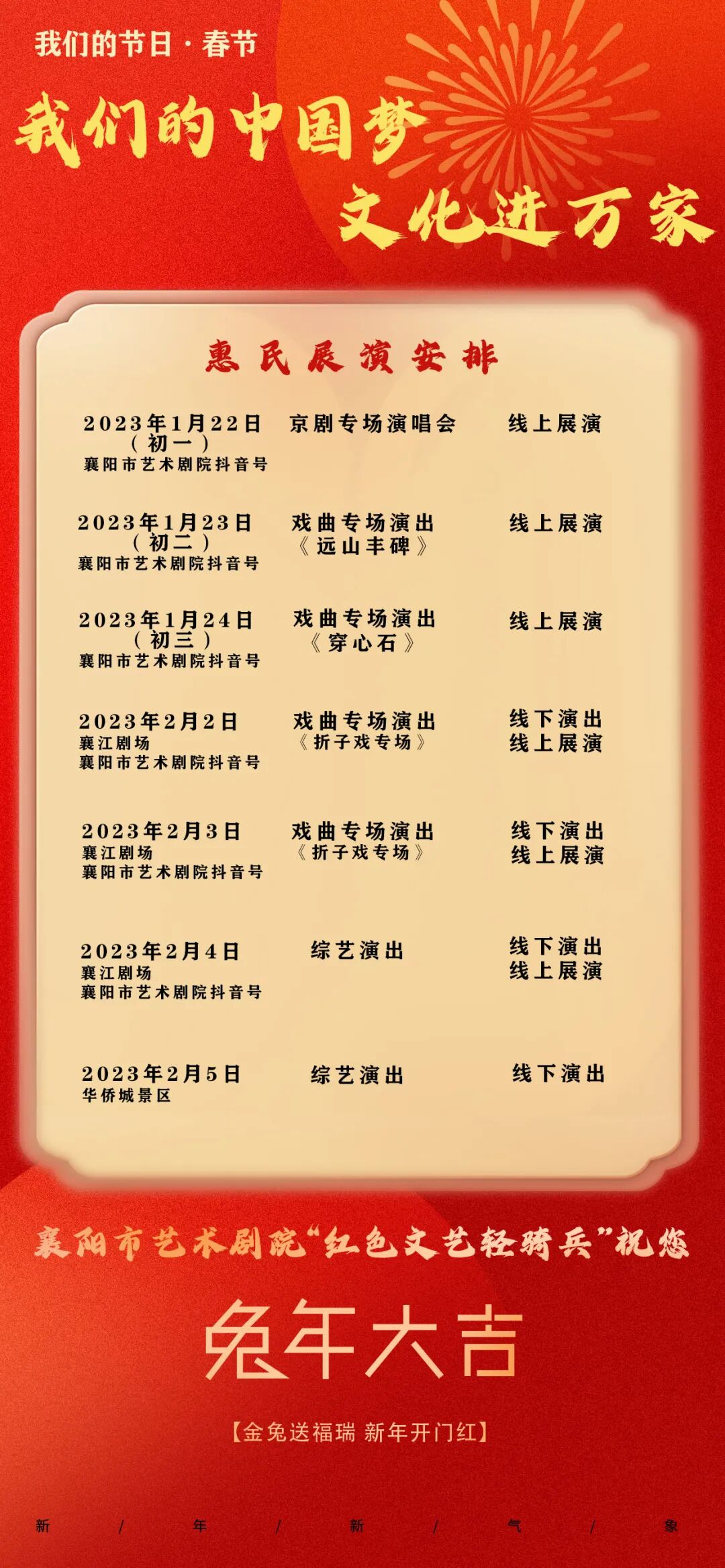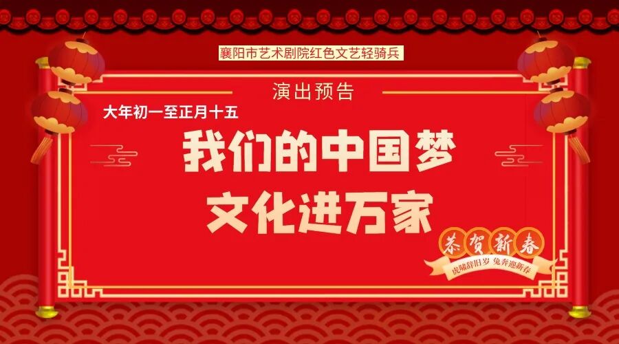 为深入学习宣传贯彻党的二十大精神,丰富群众精神文化生活,营造春节热闹喜庆的节日氛围,襄阳市艺术剧院特举行“我们的中国梦”--文化进万家贺新春系列演出活动。