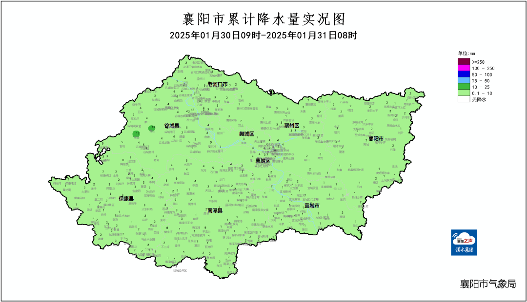 市区3.8、东门口 2.5、襄州 3.8、枣阳 1.5、宜城 0.6、保康 1.8、谷城3.2、老河口 2.7。今天凌晨至早晨,我市大部地区降小雨,保康800米以上山区降雨夹雪或雪,积雪深度1至2厘米。