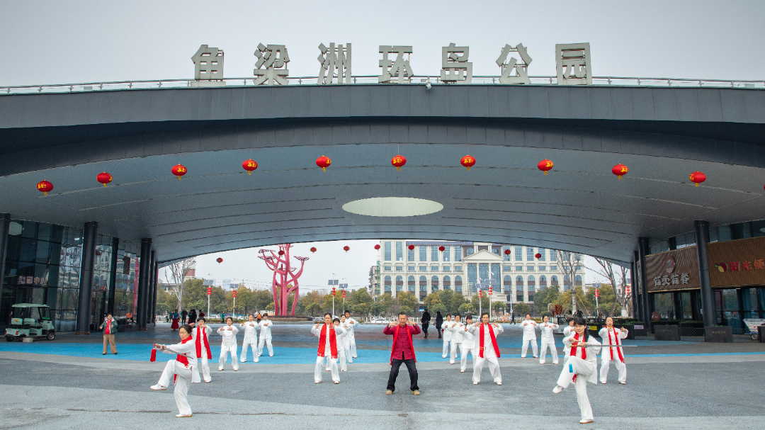 鱼梁洲游客接待中心门前广场,太极拳爱好者们整齐列队,一招一式尽显沉稳大气。太极拳的刚柔并济,不仅展示了中华传统武术的博大精深,也为新春佳节增添了一份别样的文化韵味。现场的培训环节,让更多市民有机会接触并学习太极拳,感受其独特的健身功效。