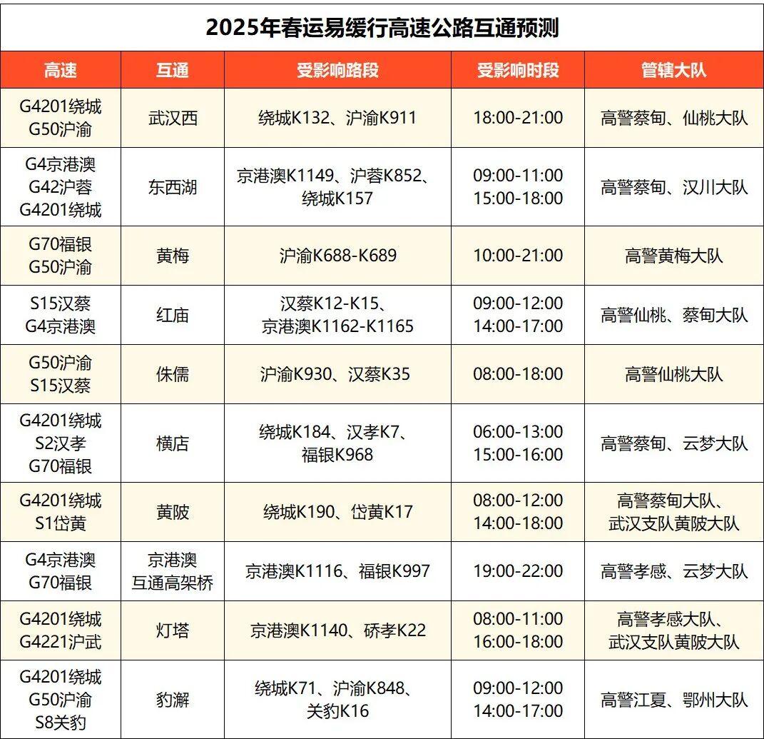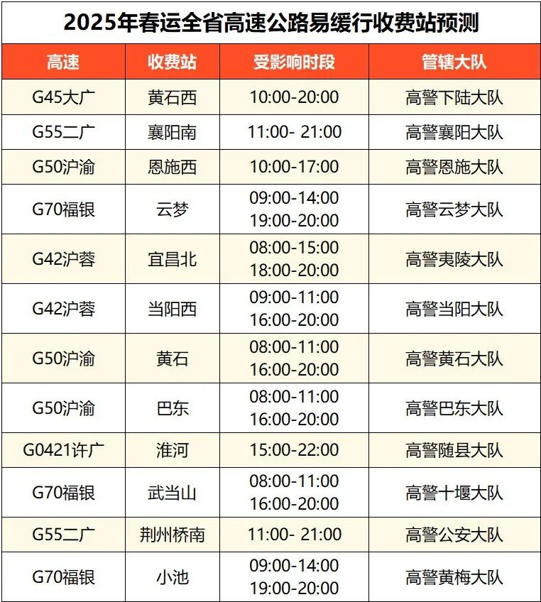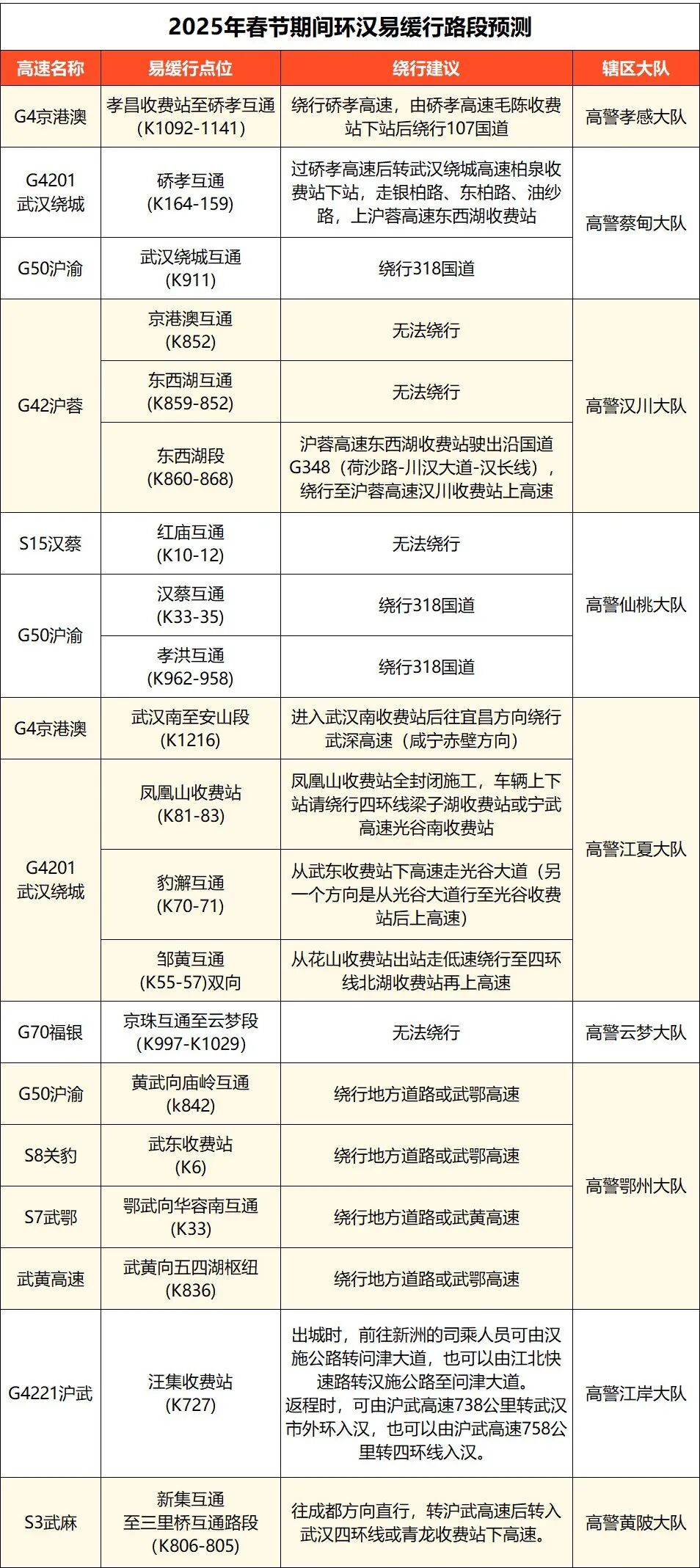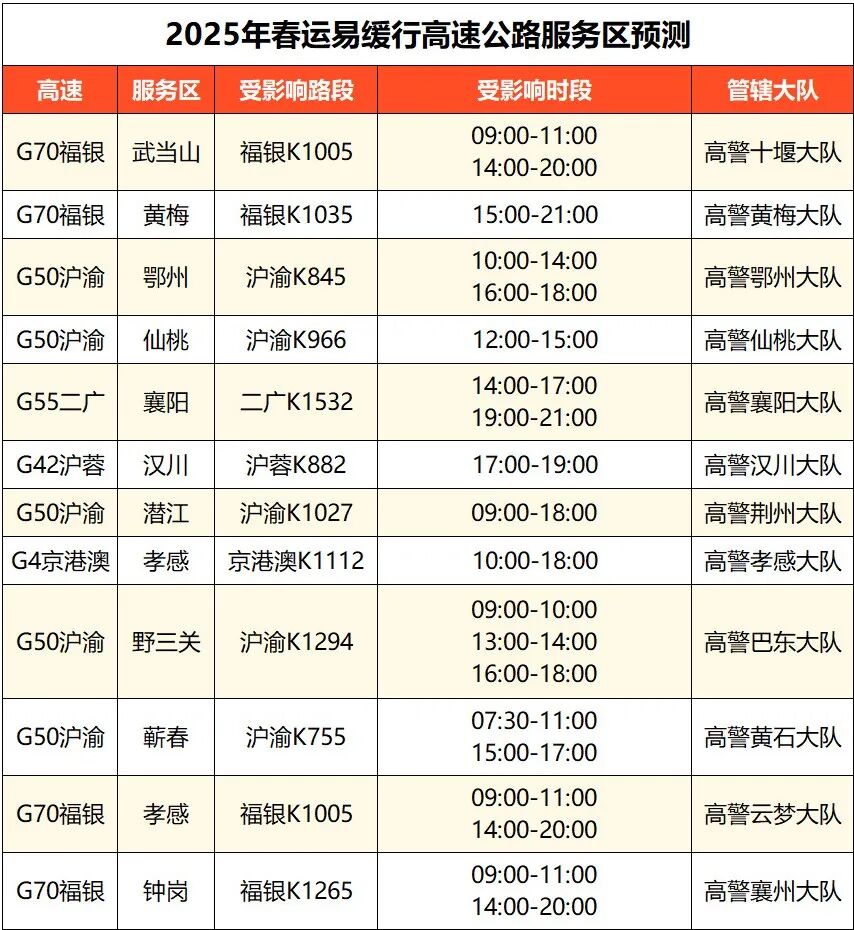 返程期间,环汉周边武汉西、武东、琴台、东西湖、黄石西、襄阳南、宜昌北等12个干线收费站,武当山、潜江、野三关等12个服务区车流相对集中,拥堵风险高。请您出行前做好充足准备,合理规划时间和路线。