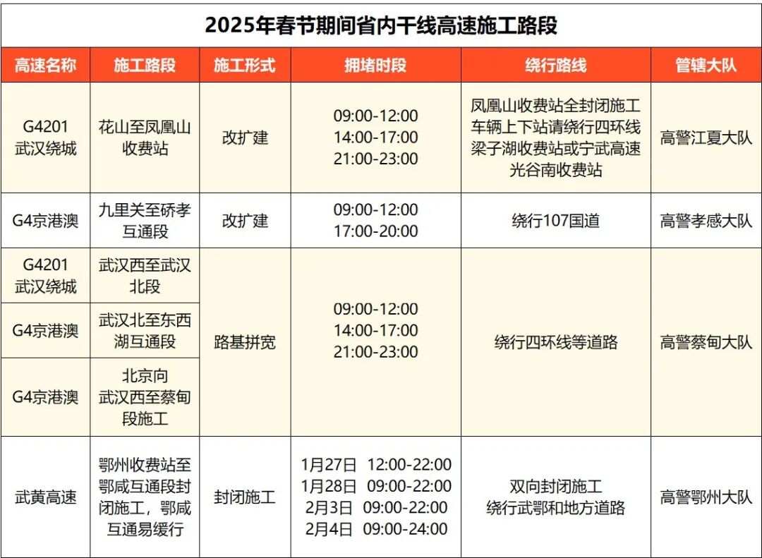 京港澳高速九里关至硚孝互通段,由于四改八改扩建施工,双向道路有较长距离单道通行,通行条件受限,加之春节假期出行需求增大,车流量大,可能会导致通行缓慢的情况,广大司乘人员可提前绕行107国道或武大高速前往目的地。
