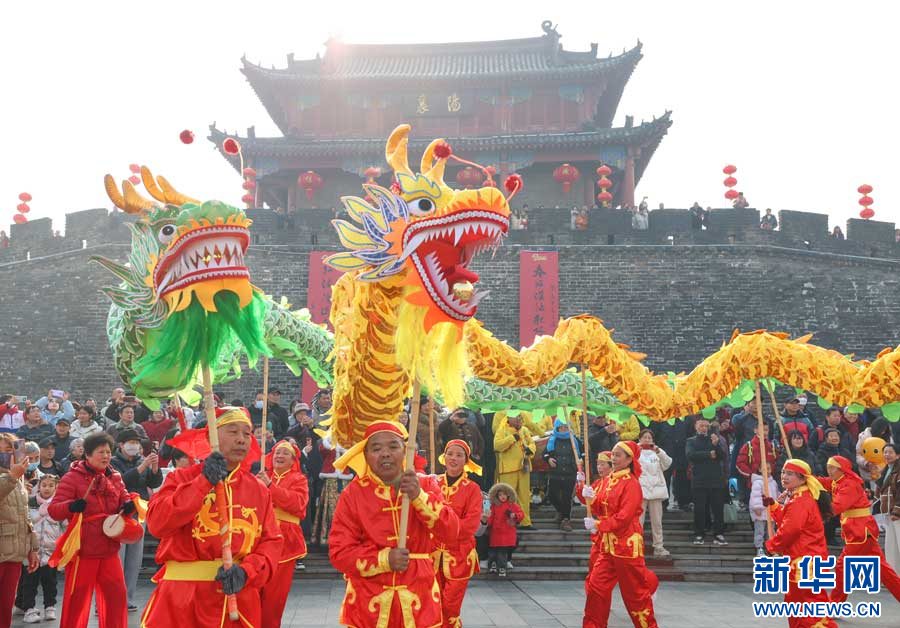 图为1月29日,在襄阳古城开展的大年初一民俗大拜年活动中,民间艺人进行舞龙舞狮表演。新华网发 杨东 摄
