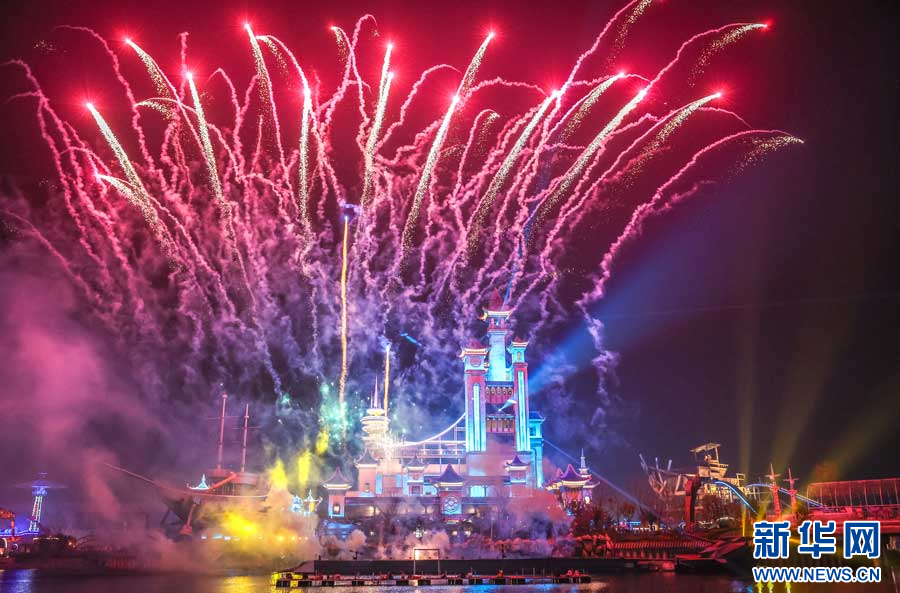 图为1月29日,在襄阳市华侨城奇幻度假区,绚烂的烟花和无人机灯光秀点亮夜空。新华网发 杨东 摄