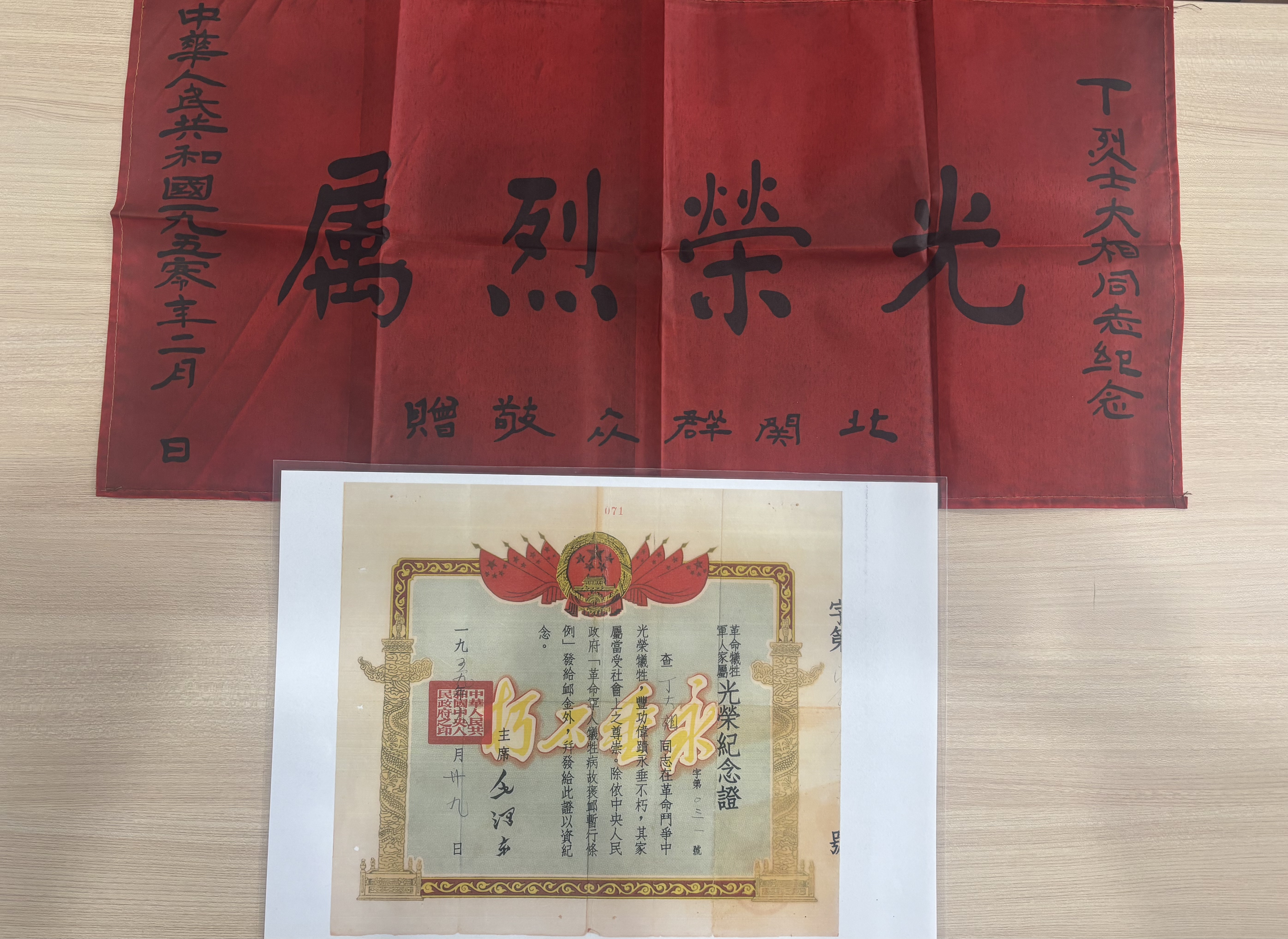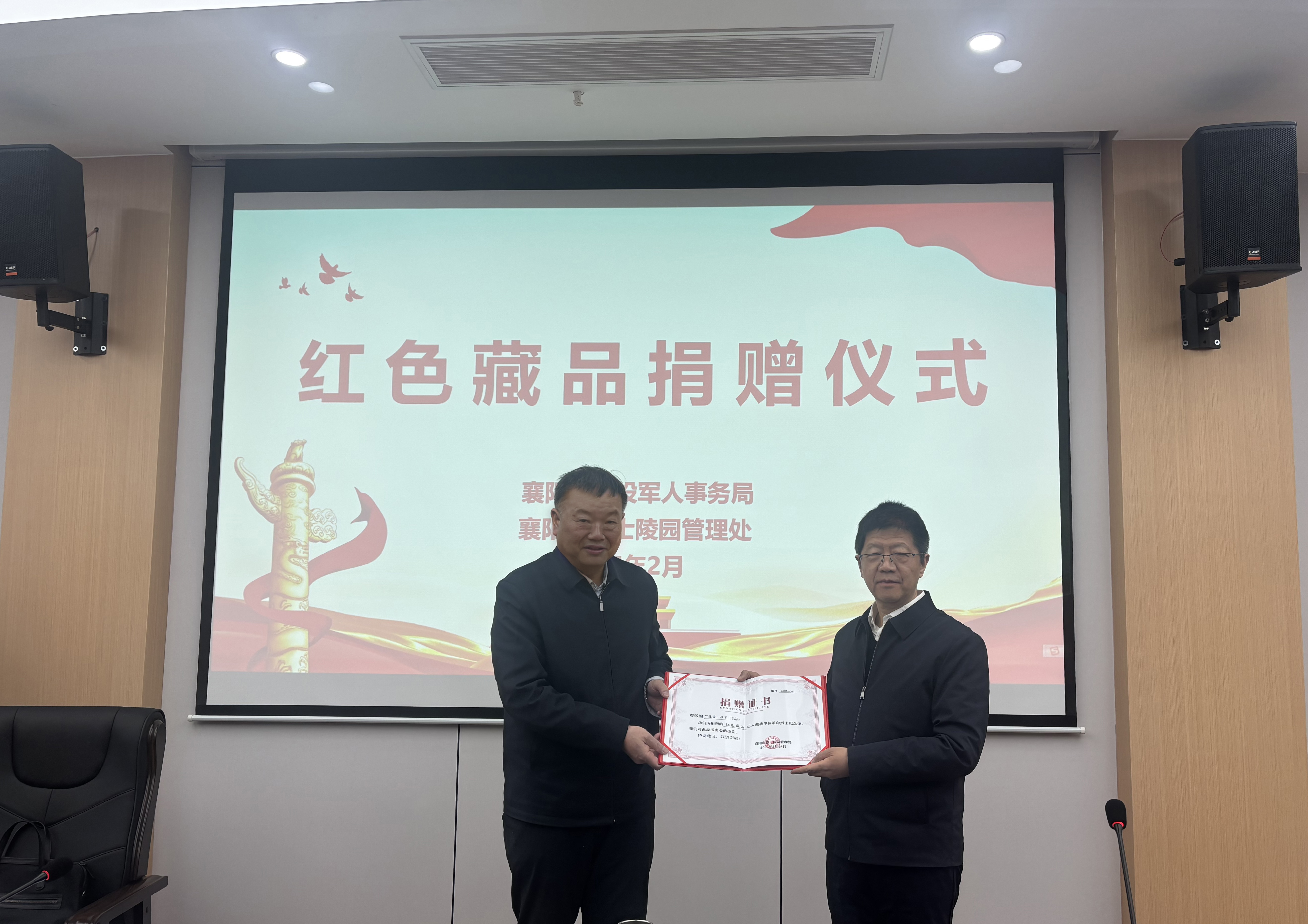 捐赠仪式现场,丁大象烈士的外孙杜军生动讲述了外公的英勇事迹,并将家里珍藏66年的《革命牺牲军人家属光荣纪念证》、枣阳北关群众向丁大象家属赠送的“光荣烈属”锦布以及丁大象女儿丁桂芳女士写的回忆录等藏品无偿捐献给襄阳革命烈士纪念馆进行展陈。