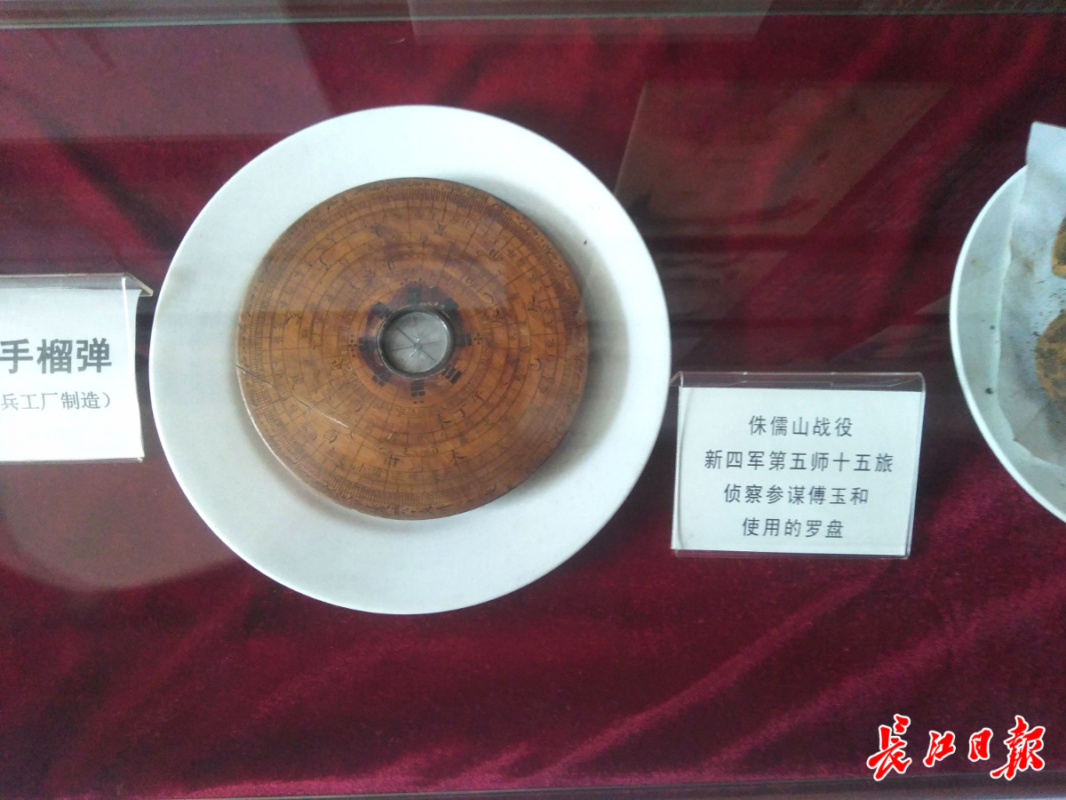“在这场战役中,我的父亲、时任新四军第五师15旅侦察参谋兼手枪队长傅玉和,就是拿着这个罗盘乔装打扮成一位看风水的道士,奉命只身潜入伪军司令部,冒着生命危险获取重要情报的。”付建桥指着展柜中一个斑驳、有划痕的旧罗盘说道。