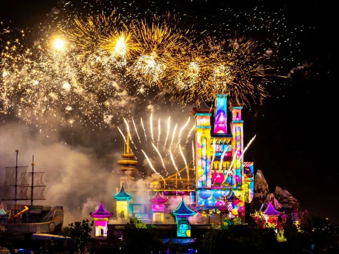 当夜幕降临,奇幻谷的夜空被绚烂烟花和火龙钢花点亮。高达9米的巨型机械麒麟喷火吐雾,送上祝福。