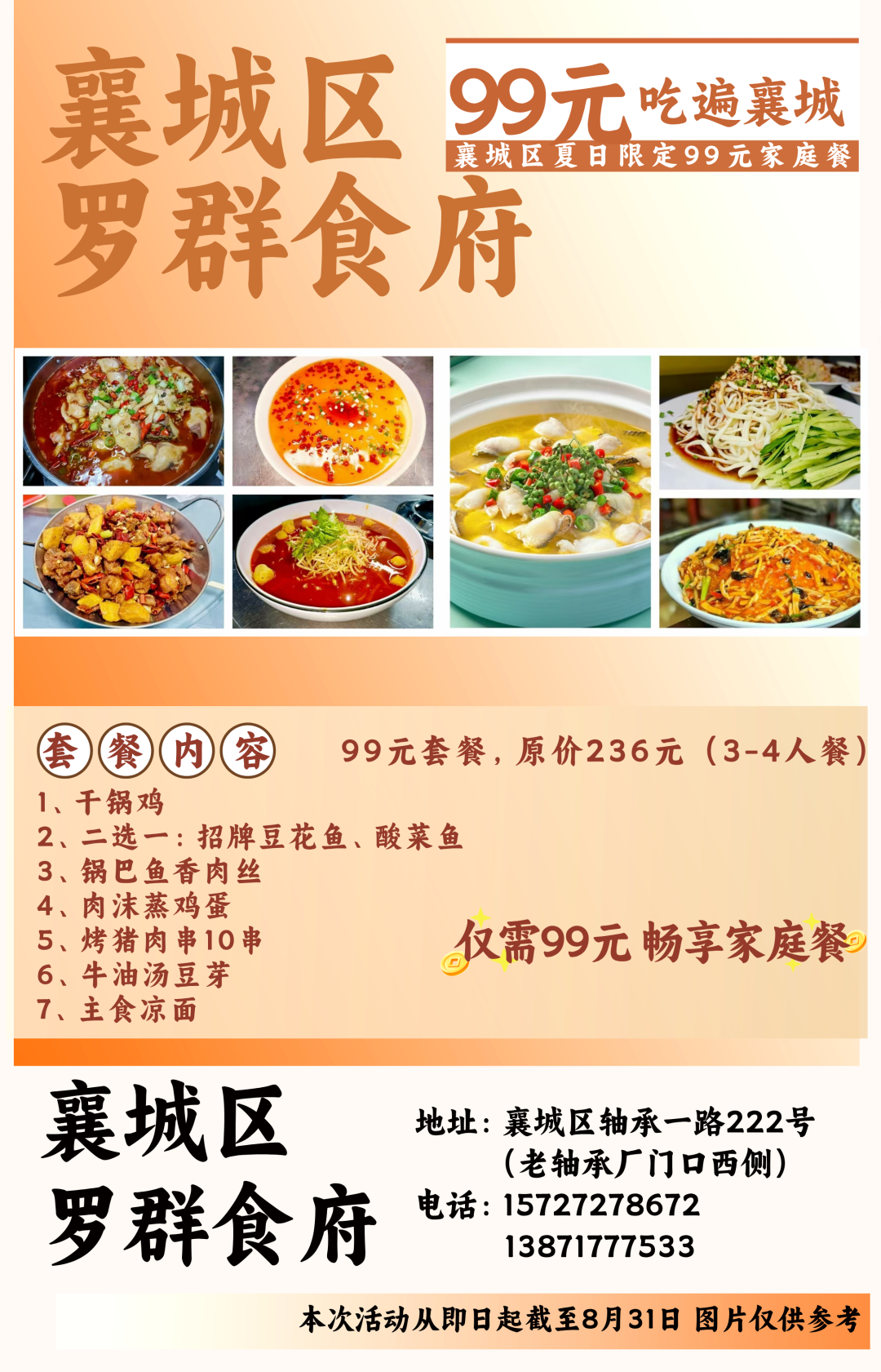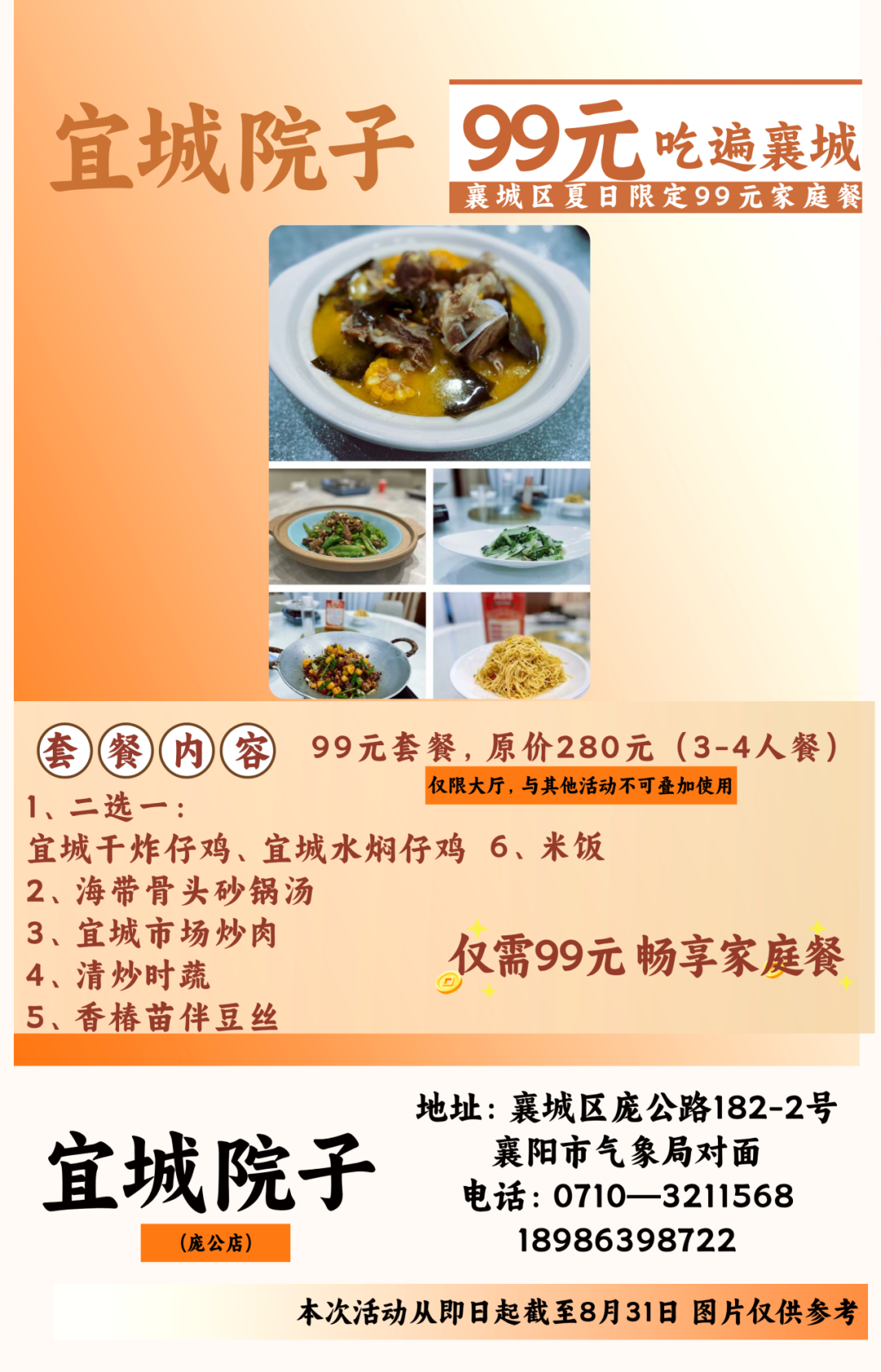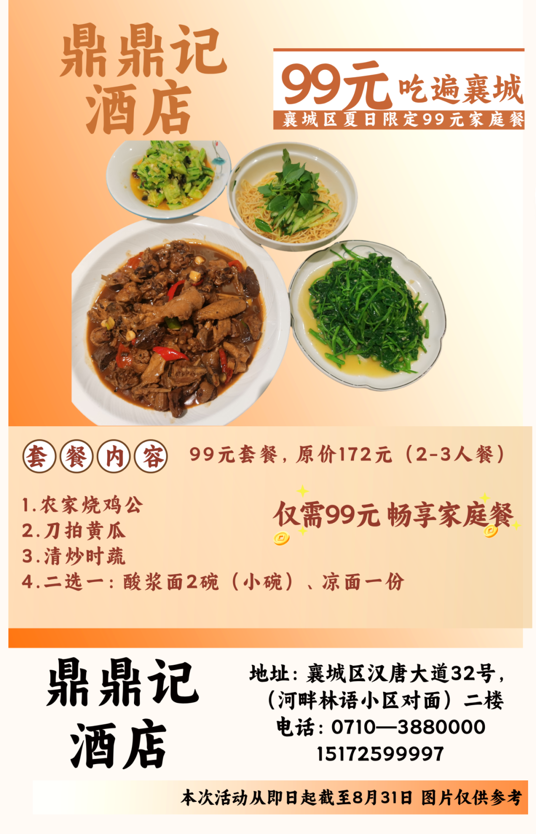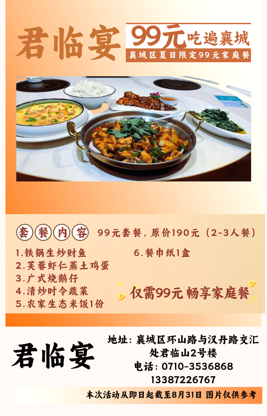 温馨提示:即日起至8月31日到店即可享用99元套餐,不需要任何凭证,同时也可在各酒店美团或抖音下订单,本套餐仅限大厅与散台、卡座,米饭、餐具免费,与其他优惠活动不可叠加使用。因就餐时间比较集中,尤其是双休日,为避免等餐时间过久,请大家提前打电话预约好就餐时间。
