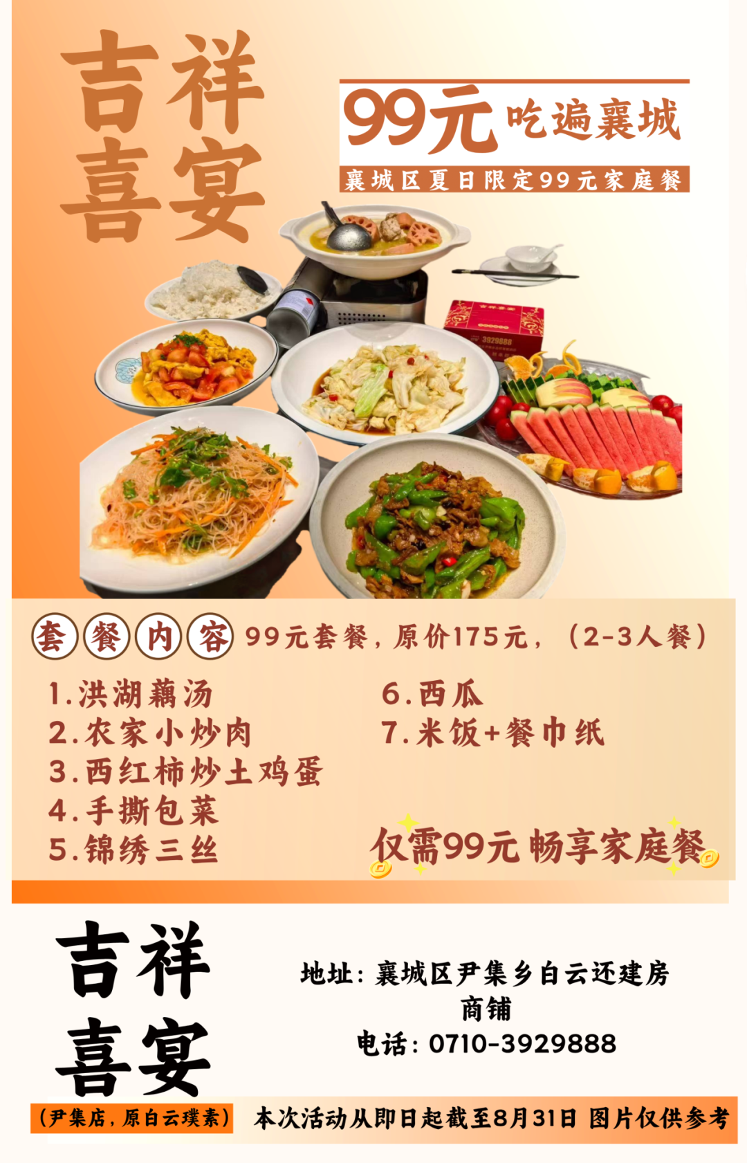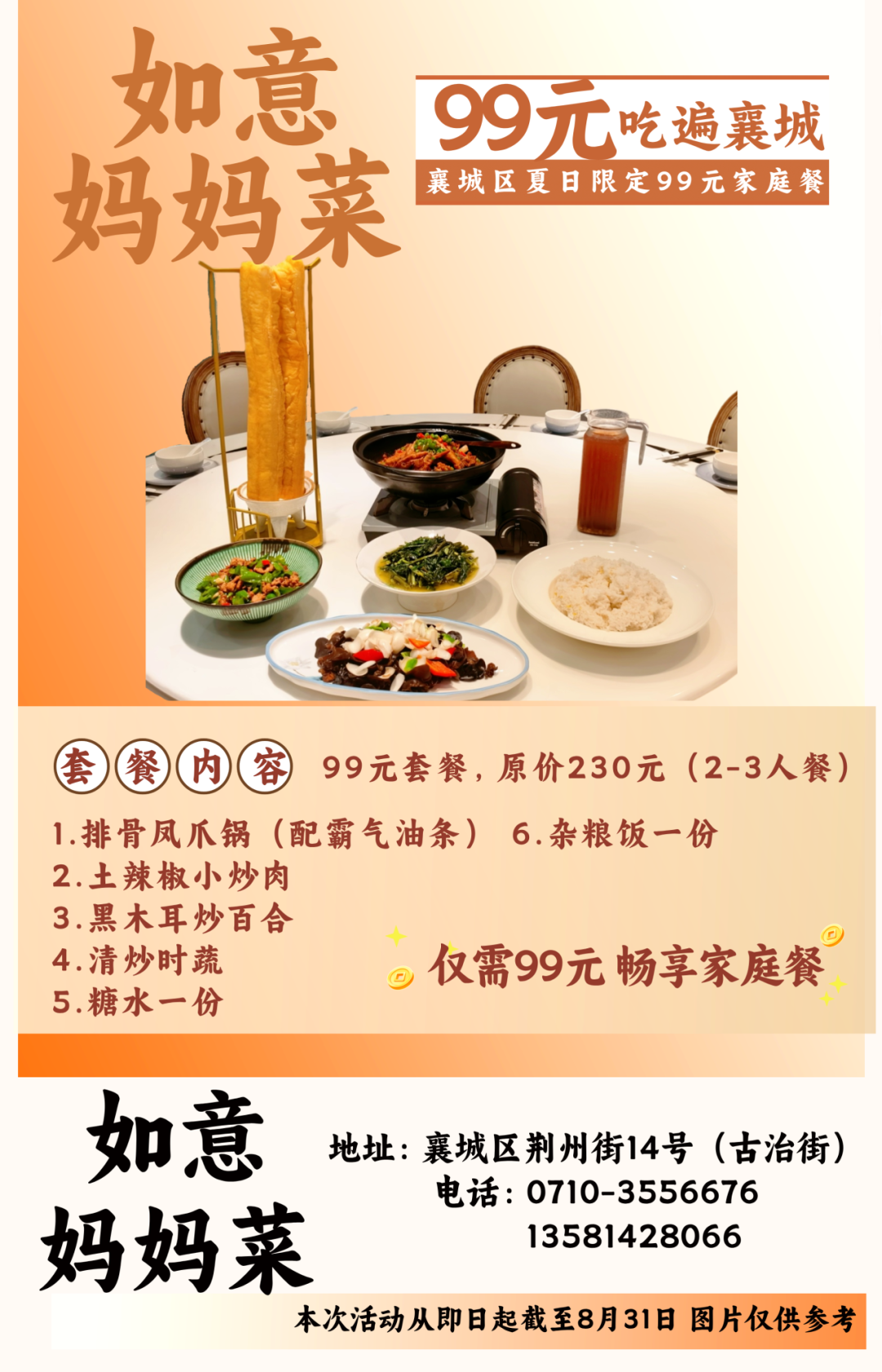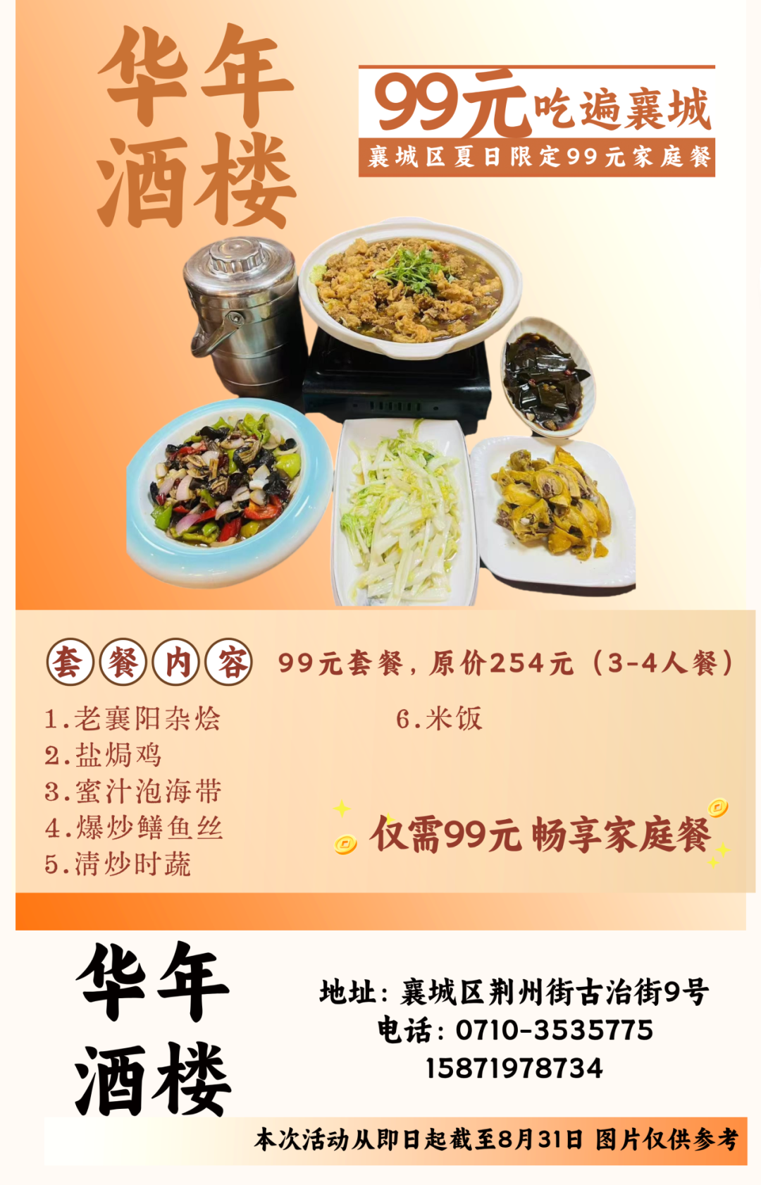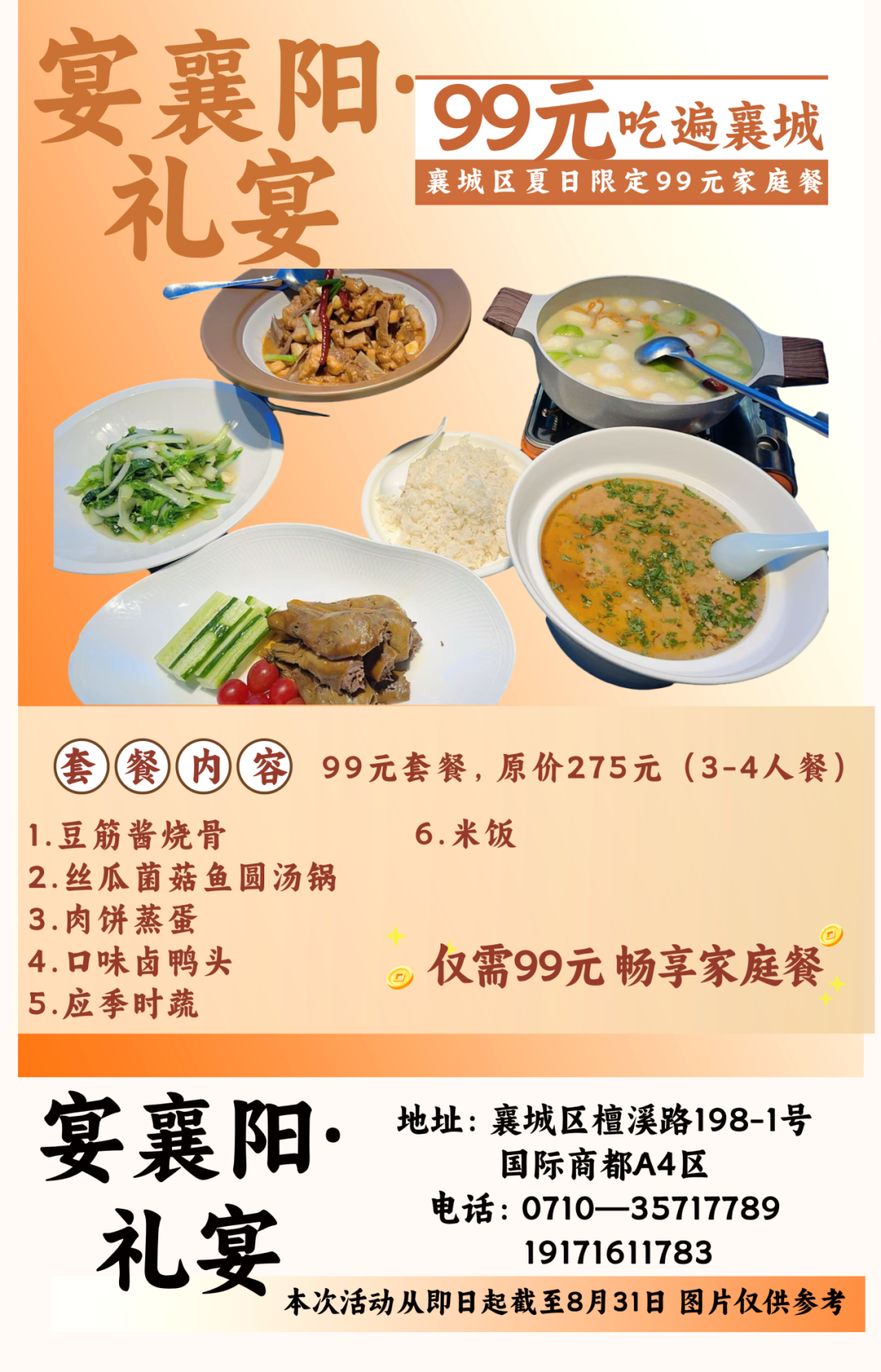 温馨提示:即日起至8月31日到店即可享用99元套餐,不需要任何凭证,同时也可在各酒店美团或抖音下订单,本套餐仅限大厅与散台、卡座,米饭、餐具免费,与其他优惠活动不可叠加使用。因就餐时间比较集中,尤其是双休日,为避免等餐时间过久,请大家提前打电话预约好就餐时间。