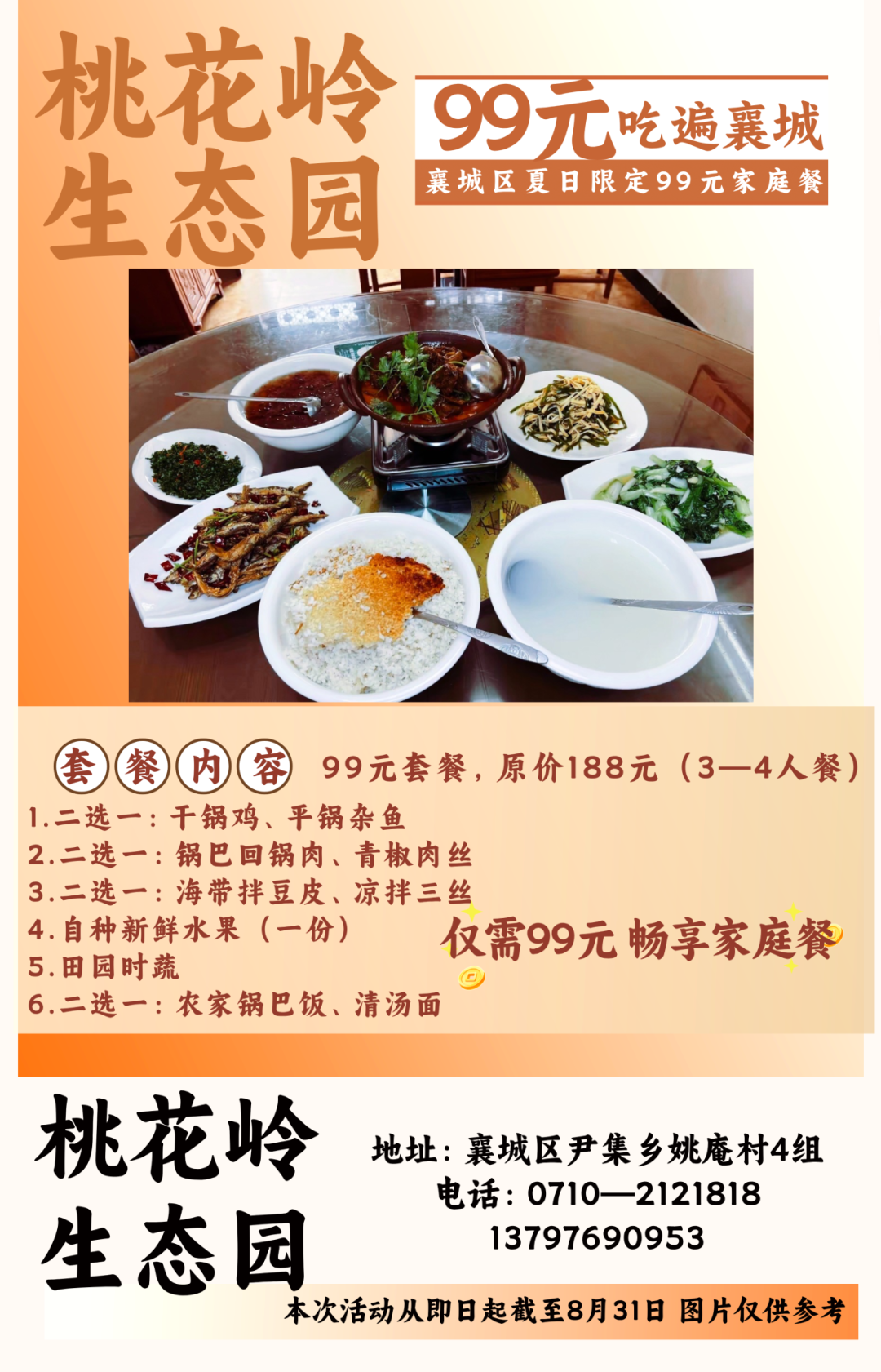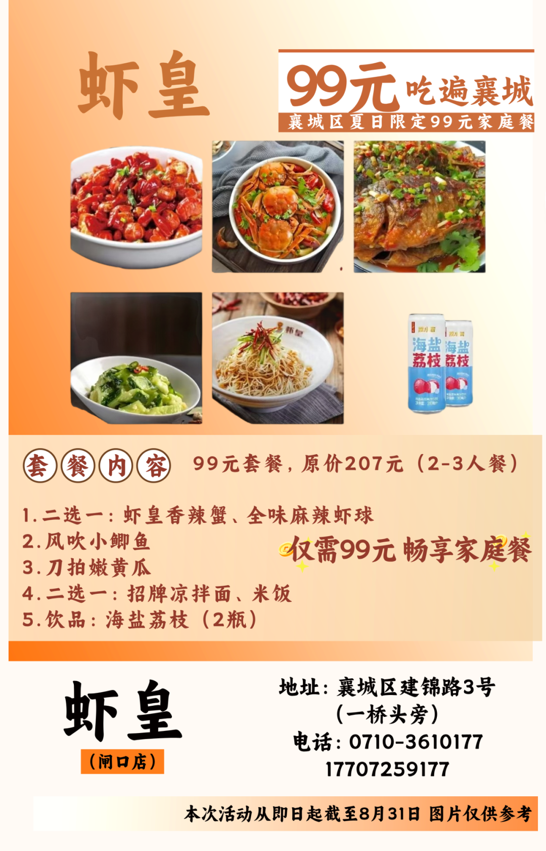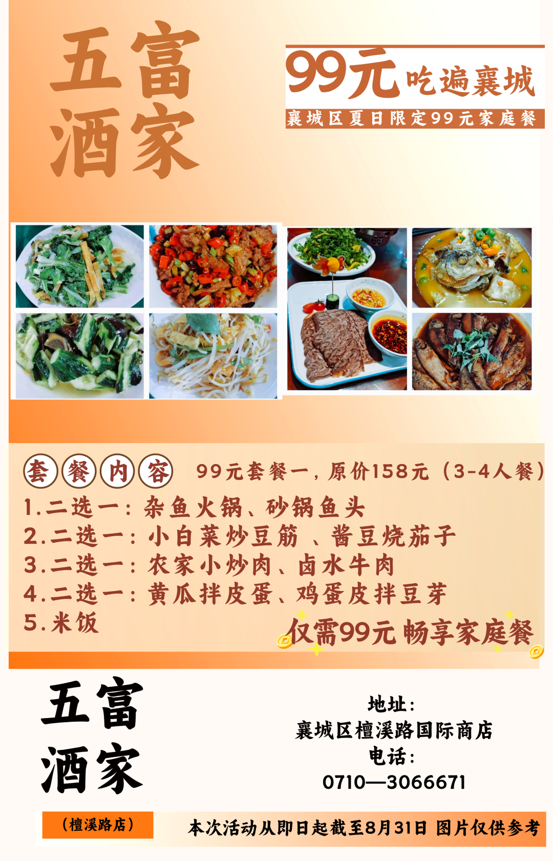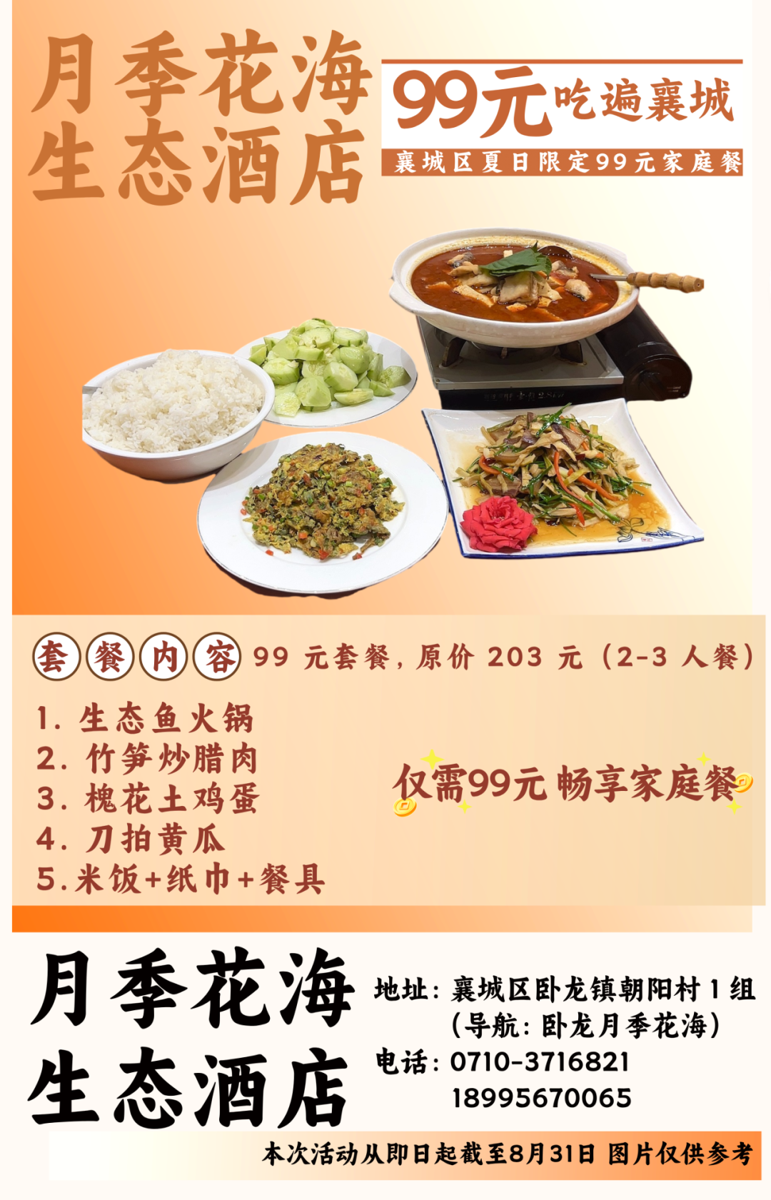 温馨提示:即日起至8月31日到店即可享用99元套餐,不需要任何凭证,同时也可在各酒店美团或抖音下订单,本套餐仅限大厅与散台、卡座,米饭、餐具免费,与其他优惠活动不可叠加使用。因就餐时间比较集中,尤其是双休日,为避免等餐时间过久,请大家提前打电话预约好就餐时间。