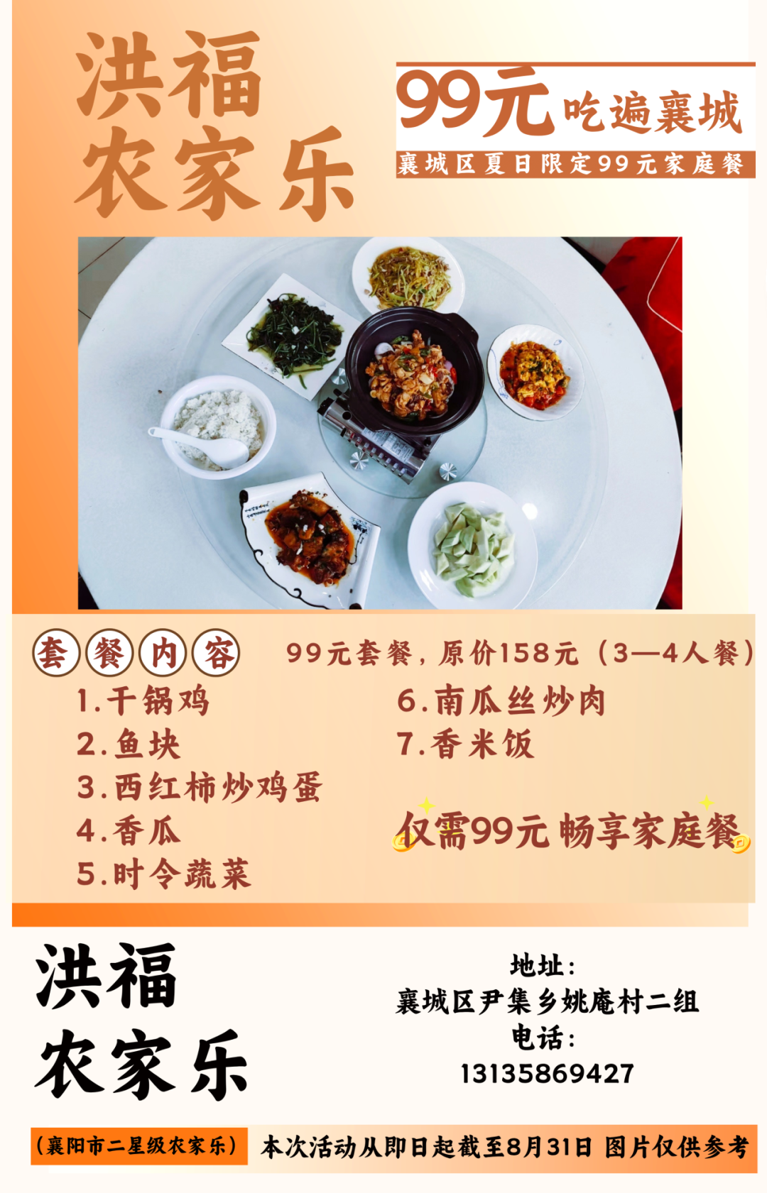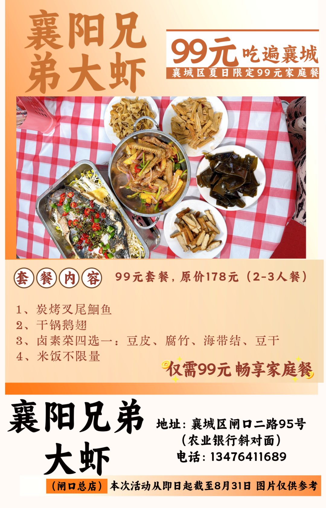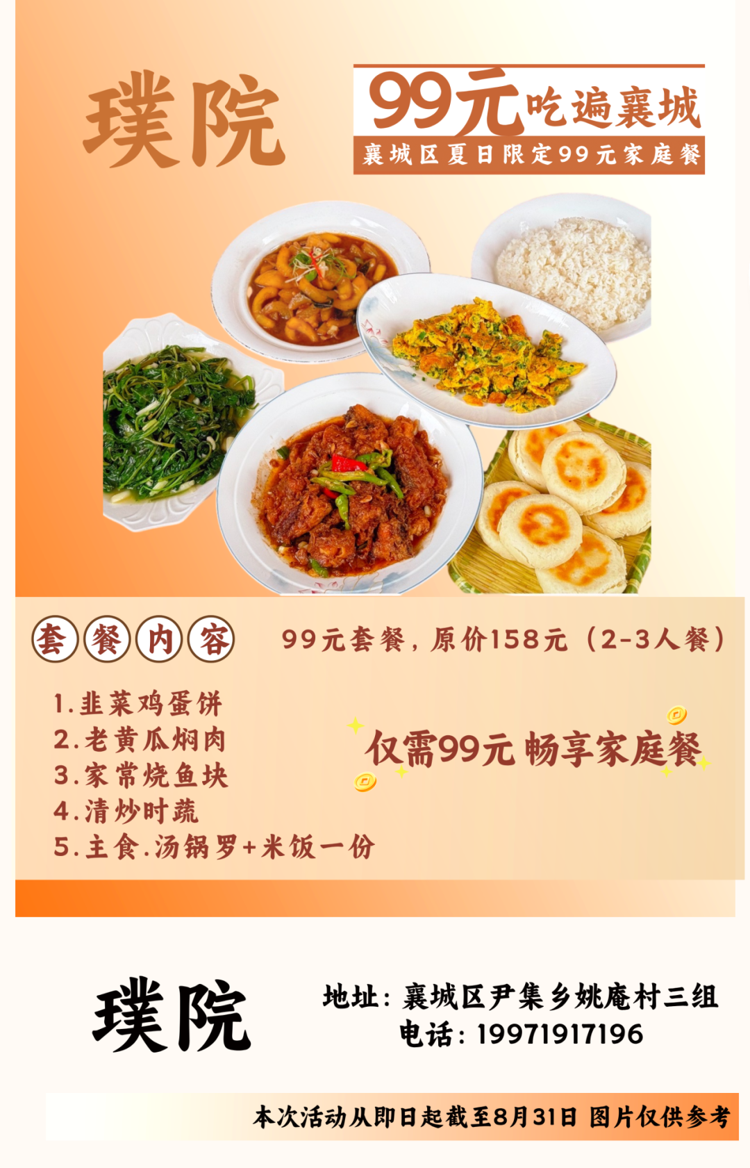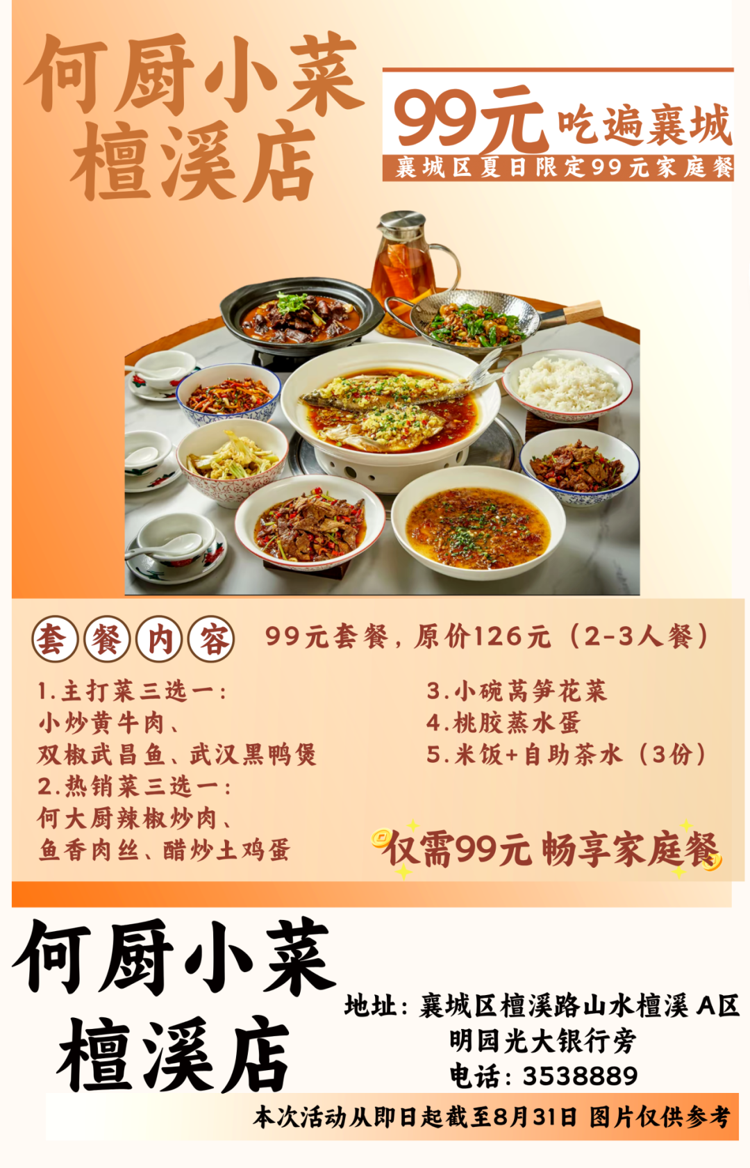 温馨提示:即日起至8月31日到店即可享用99元套餐,不需要任何凭证,同时也可在各酒店美团或抖音下订单,本套餐仅限大厅与散台、卡座,米饭、餐具免费,与其他优惠活动不可叠加使用。因就餐时间比较集中,尤其是双休日,为避免等餐时间过久,请大家提前打电话预约好就餐时间。