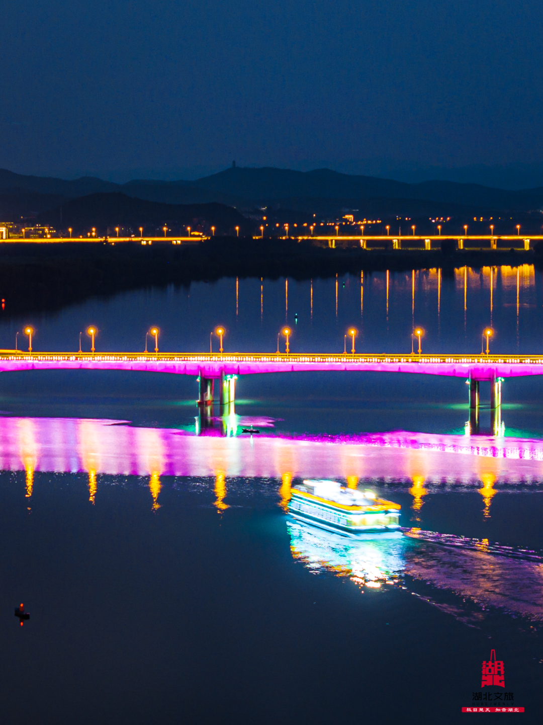 游轮缓缓离港,波光粼粼的江面倒映着两岸灯火。一侧,千年襄阳古城墙在金色灯带勾勒下巍然矗立,另一侧,现代都市的摩天楼宇霓虹闪烁。