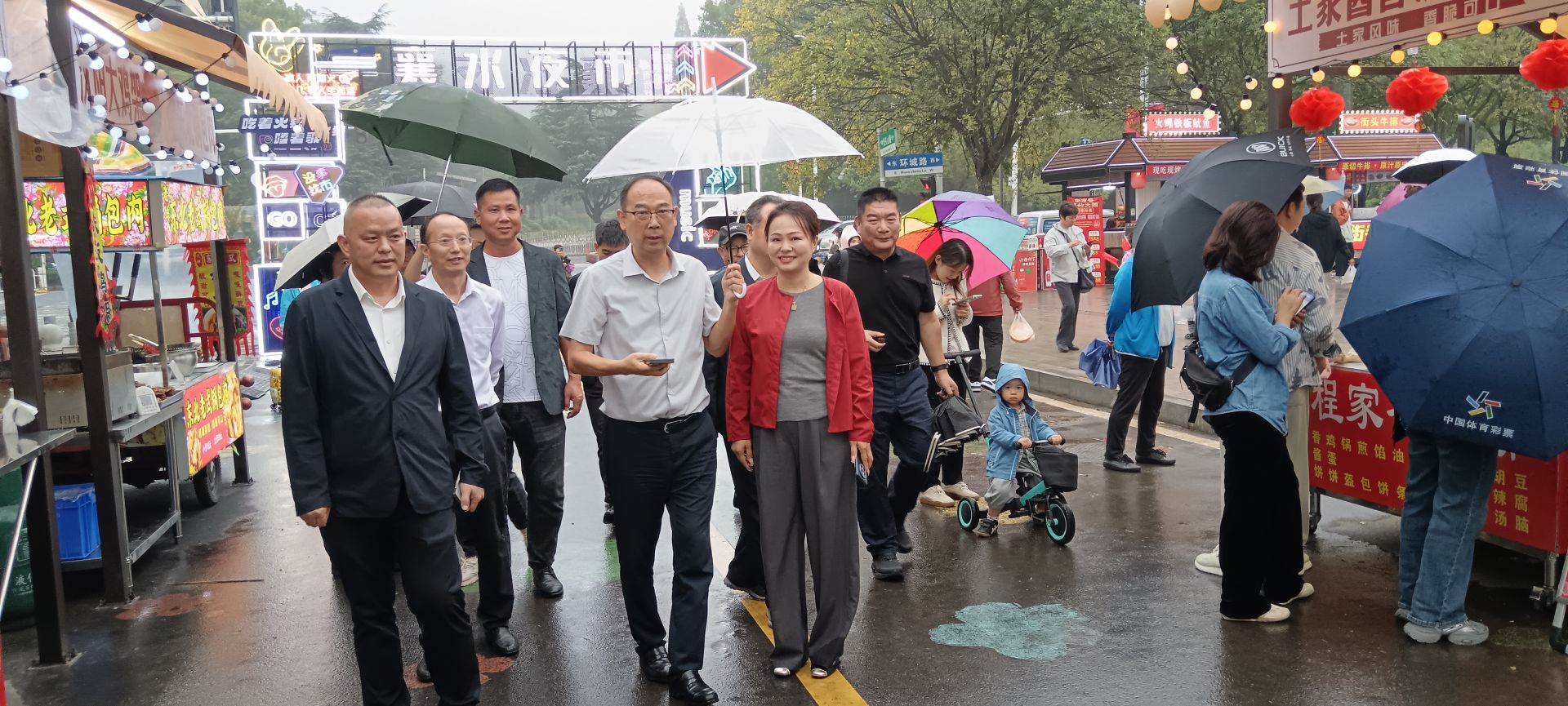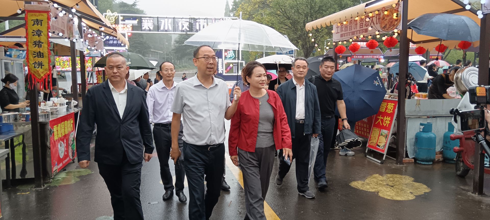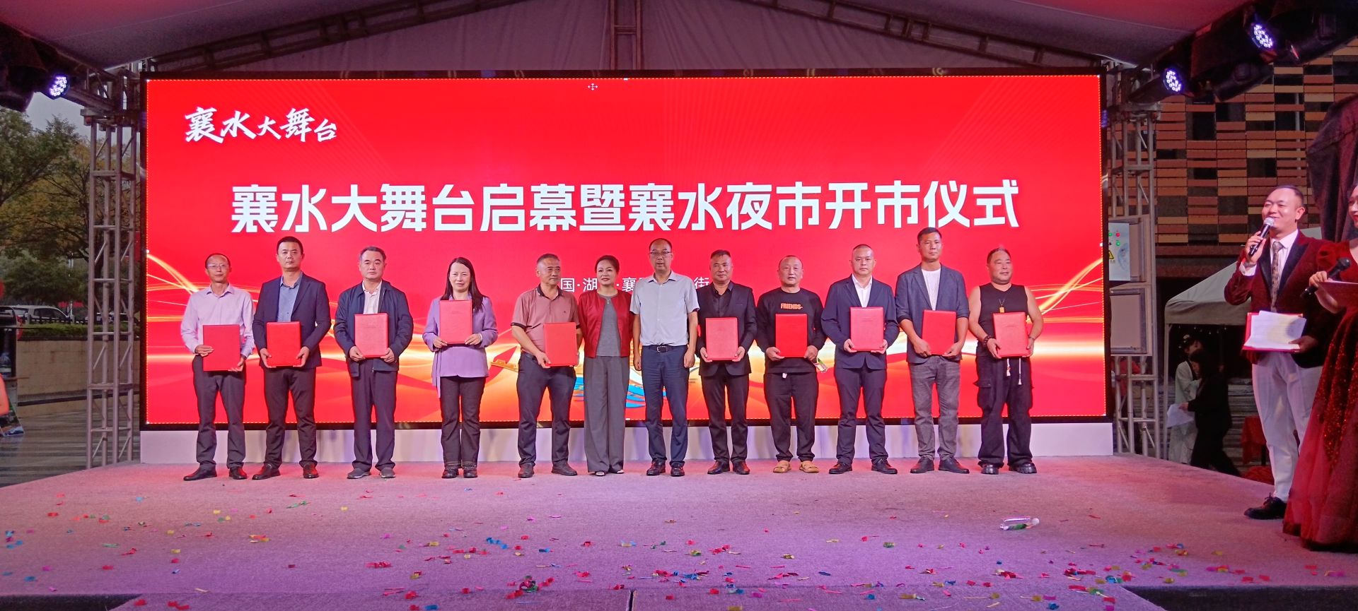 接着,进行了隆重的剪彩和揭幕仪式。剪彩嘉宾和领导—王明浩、刘佳、罗月、周拥军、曾八琳、马善记、艾志宏、姜君、周万波共同登台,为襄水大舞台启幕剪彩;同时,湖北襄水文化传播有限公司董事黄昕和胡旭明率领项目团队为襄水夜市开市揭幕。金剪齐开,标志着襄水大舞台正式点亮文化之光,襄水夜市正式点燃烟火之趣。