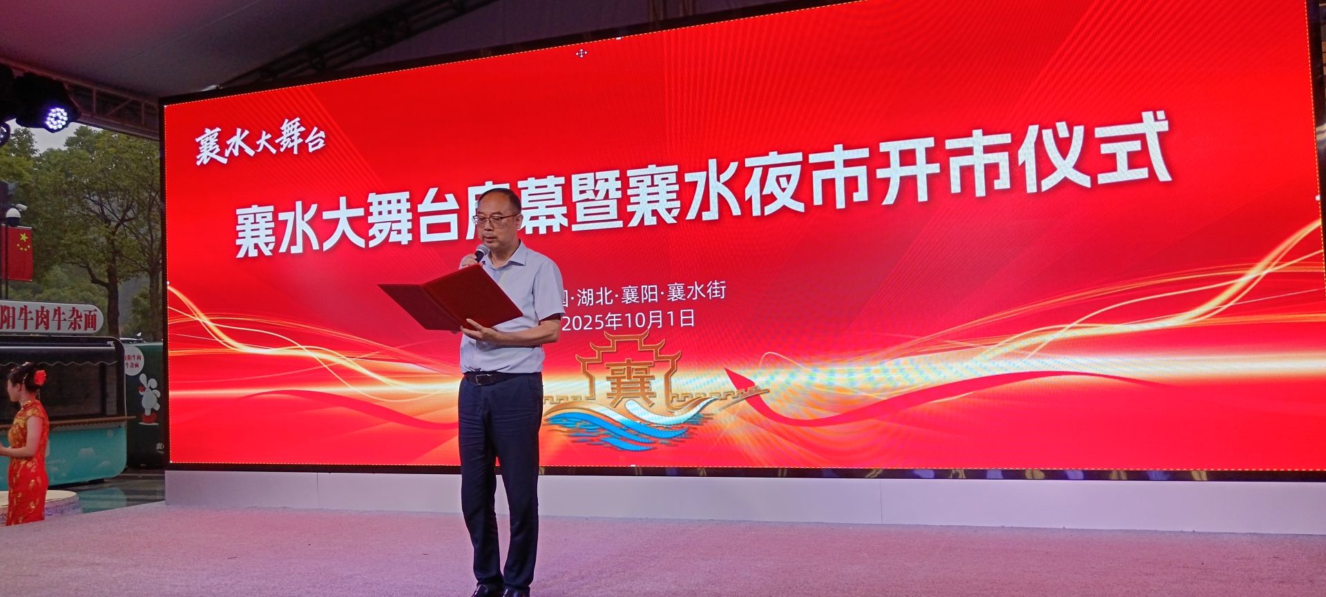 湖北襄水文化传播有限公司执行董事、襄水大舞台和襄水夜市总策划人姜君上台致辞。他表示,襄阳拥有2800多年的建城史,文化底蕴深厚,烟火气息浓郁。襄水大舞台和襄水夜市的打造,旨在让千年文脉焕发新生,让城市夜晚更迷人。襄水大舞台将以“全民参与”为核心,打破专业与业余、舞台与观众的距离,让每一位市民都能成为文化的参与者和受益者。未来,这里将有各种节目常态化上演,还会推出梯度赛事,打造全民共创的文化IP。襄水夜市则是项目的“消费引擎”,近200个摊位、100余种特色小吃,以及本地土特产、非遗手作、襄水主题文创等,将让游客在逛吃购中触摸襄阳文化肌理。