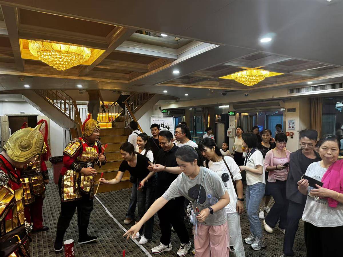江面上,“黄鹤楼号”游船流光溢彩。“哇!这不是岳飞大将军吗?”游客惊喜地谈论着。英姿飒爽、身披盔甲的“岳飞”及其麾下“岳家军”扮演者正列队等候,随后带领游客前往招募处立投名状,继而步入二楼观赏《满江红·岳飞在武汉》沉浸式情景剧。剧情演绎到岳飞“国破山河在”的壮志豪情时,掌声阵阵,叫好不绝,并自发跟着演员复诵全诗,仿佛带领观众穿越回南宋岁月,体验了一场爱国情怀与现代演绎深度融合的文化盛宴。