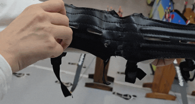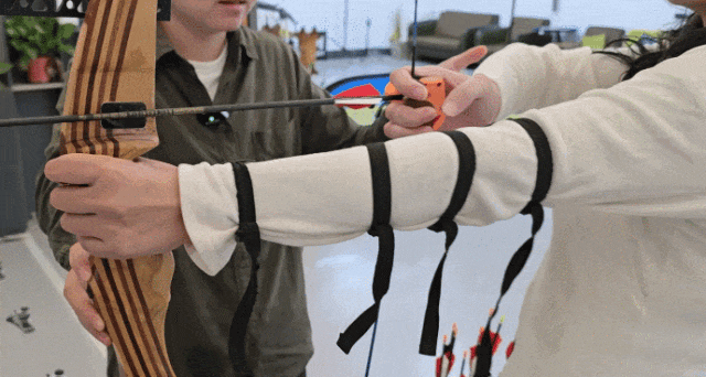 按地上的脚印站好,左手持弓,右手浅浅勾住弓弦——注意!手指只要“浅浅勾”,别深扣,不然会伤手。