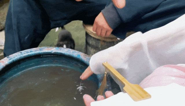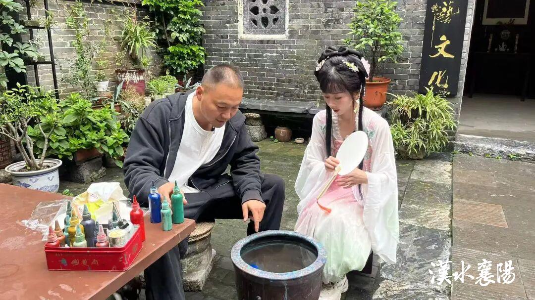 先给素净的扇柄细细蘸满水,形成一层薄薄的水膜——这一步能有效隔绝漆料,避免扇柄意外着色,让成品扇的细节更显精致。