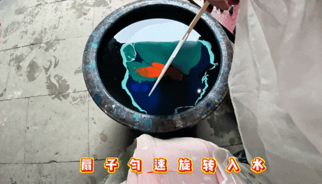将备好的纸扇斜斜插入水中,手腕轻晃带动扇面微微摆动,再匀速旋转一圈,让水面的漆纹完整 “印” 在扇面上。