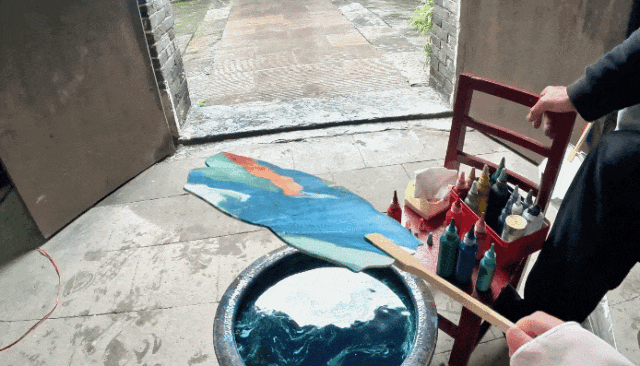 利用大漆与水不相溶的物理特性,将调好的湛蓝、朱红、墨绿、米白等色漆,轻轻滴入清水中。漆料会在水面自然舒展、晕染,慢慢形成如流云、似晚霞的独特纹路,每一次滴落都是不可复制的惊喜。