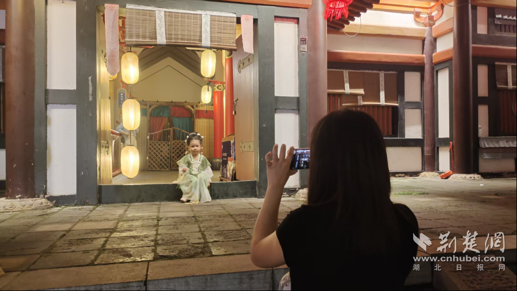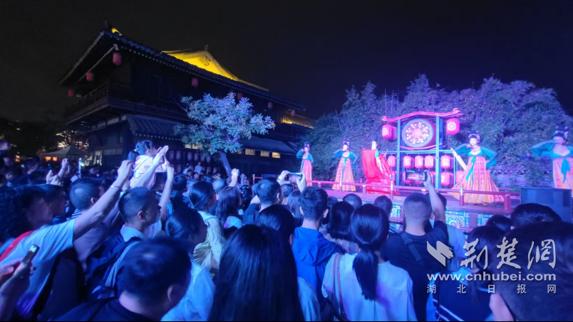当暮色降临,万盏灯火次第点亮。朱雀大街流光溢彩,亭台楼阁金碧交辉,整个唐城宛若从历史长河中浮起。10月5日晚,记者在襄阳盛世唐城景区(以下简称唐城)看到,身着唐制汉服的游客执扇提灯,漫步于青石路上,与巡游的礼宾使含笑致意。这一刻,现实与历史的边界悄然消融。