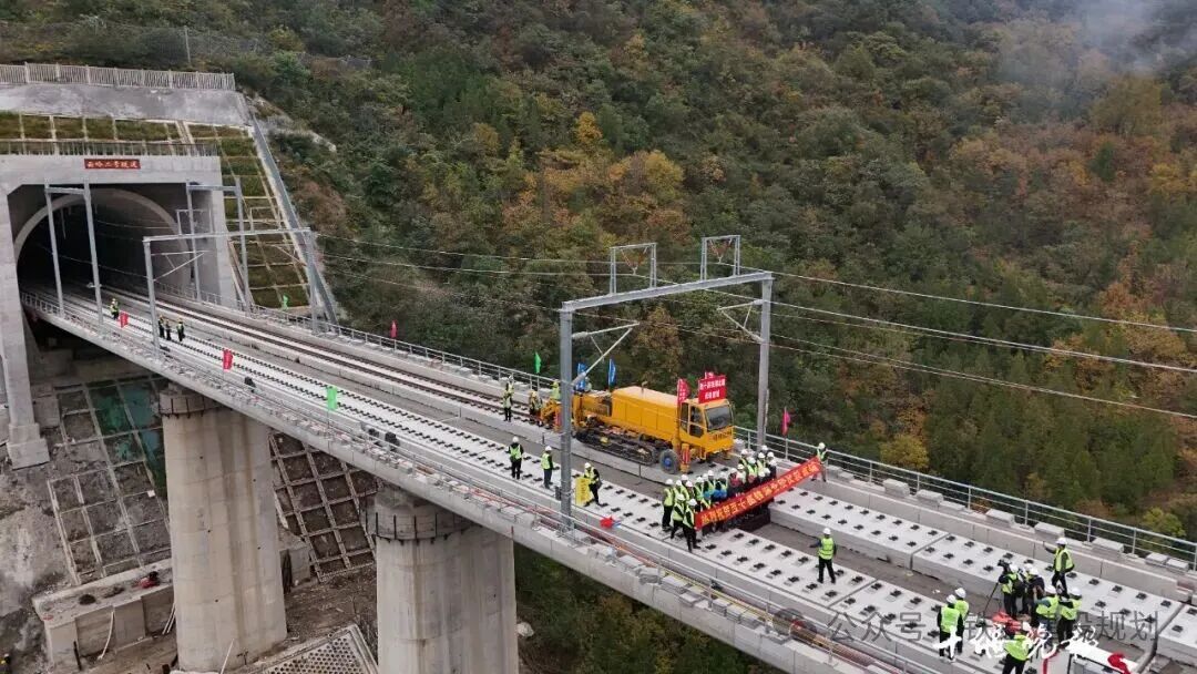 10月31日上午,在鄂陕交界处的西十高铁云岭二号隧道内,随着一对500米长钢轨从轨道车上缓缓吐出,跨越两省边界,标志着西十高铁铺轨从陕西进入湖北,湖北段开始铺轨。